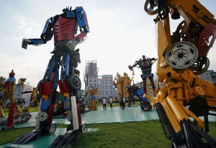 游客在邢台德龙钢铁有限公司参观钢铁雕塑。新华社记者 杨世尧 摄