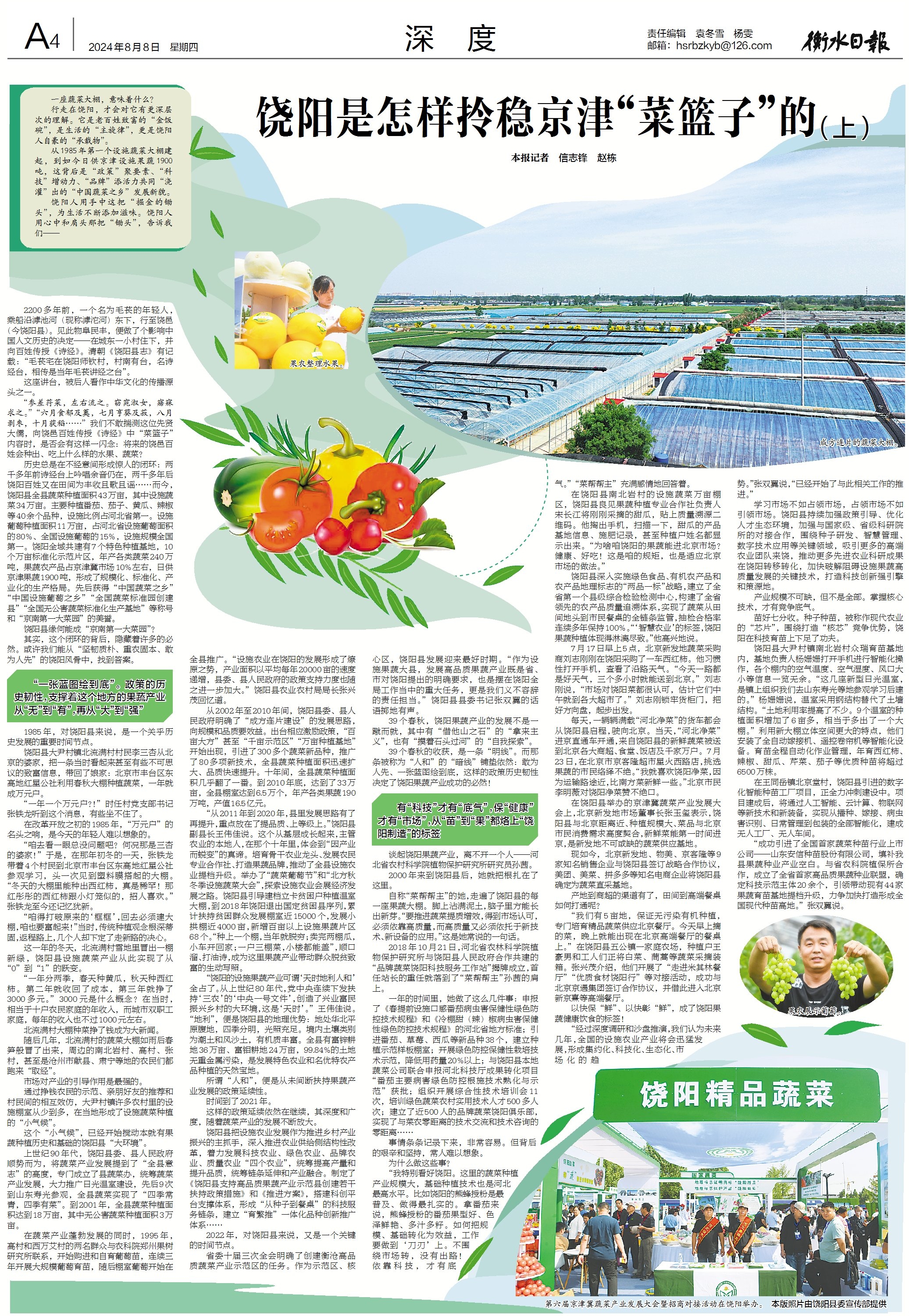 在饶阳县举办的京津冀蔬菜产业发展大会上,北京新发地市场董事长张玉玺表示,饶阳县与北京距离近、种植规模大、菜品与北京市民消费需求高度契合,新鲜菜能第一时间进京,是新发地不可或缺的蔬菜供应基地。