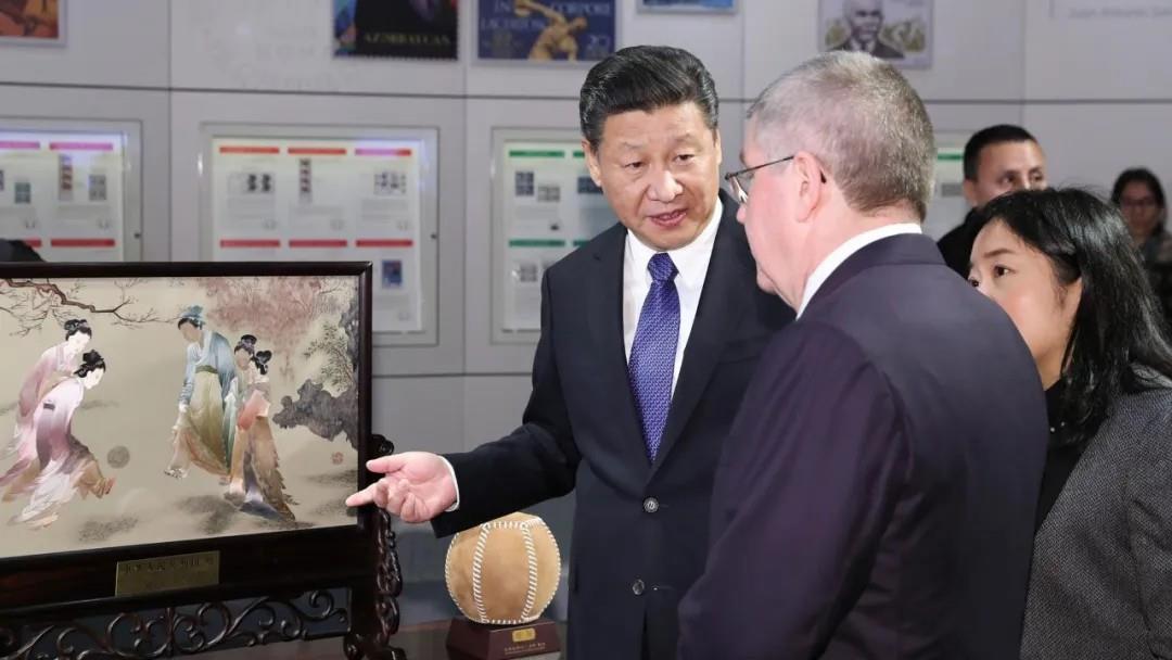 2017年1月,习近平主席在访问瑞士期间,专程来到坐落在洛桑半山腰的国际奥林匹克博物馆。这是中国国家元首首次到访。习近平主席代表中国向国际奥委会赠送了苏绣《仕女蹴鞠图》,并在留言簿上用中文写下:“弘扬奥运精神,促进和平发展”。