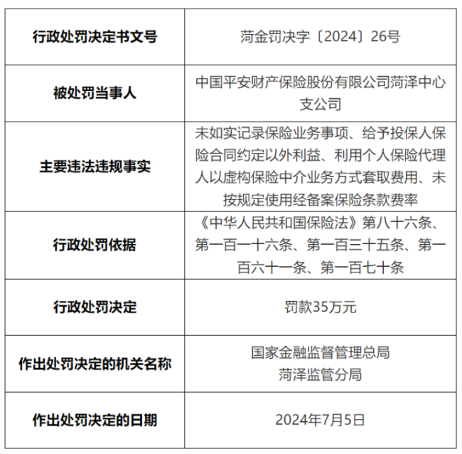 近日,国家金融监督管理总局山东监管局公示的行政处罚决定书(菏金罚决字〔2024〕26号)显示,中国平安财产保险股份有限公司菏泽中心支公司因未如实记录保险业务事项、给予投保人保险合同约定以外利益、利用个人保险代理人以虚构保险中介业务方式套取费用、未按规定使用经备案保险条款费率,依据《中华人民共和国保险法》第八十六条、第一百一十六条、第一百三十五条、第一百六十一条、第一百七十条,被罚款35万元。