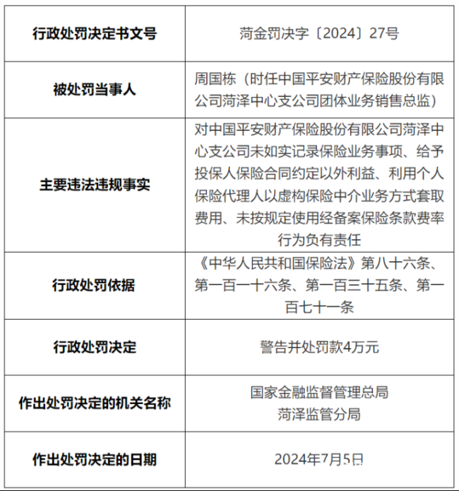 同日公示的行政处罚决定书(菏金罚决字〔2024〕27号)显示,周国栋,时任中国平安财产保险股份有限公司菏泽中心支公司团体业务销售总监,对中国平安财产保险股份有限公司菏泽中心支公司未如实记录保险业务事项、给予投保人保险合同约定以外利益、利用个人保险代理人以虚构保险中介业务方式套取费用、未按规定使用经备案保险条款费率行为负有责任,被警告并处罚款4万元。
