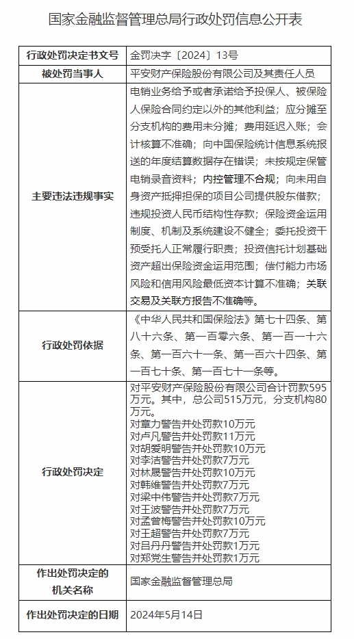 此前,5月17日,国家金融监督管理总局披露的罚单显示,平安财产保险股份有限公司因14项违法违规行为,被合计罚款595万元。其中,总公司515万元,分支机构80万元。