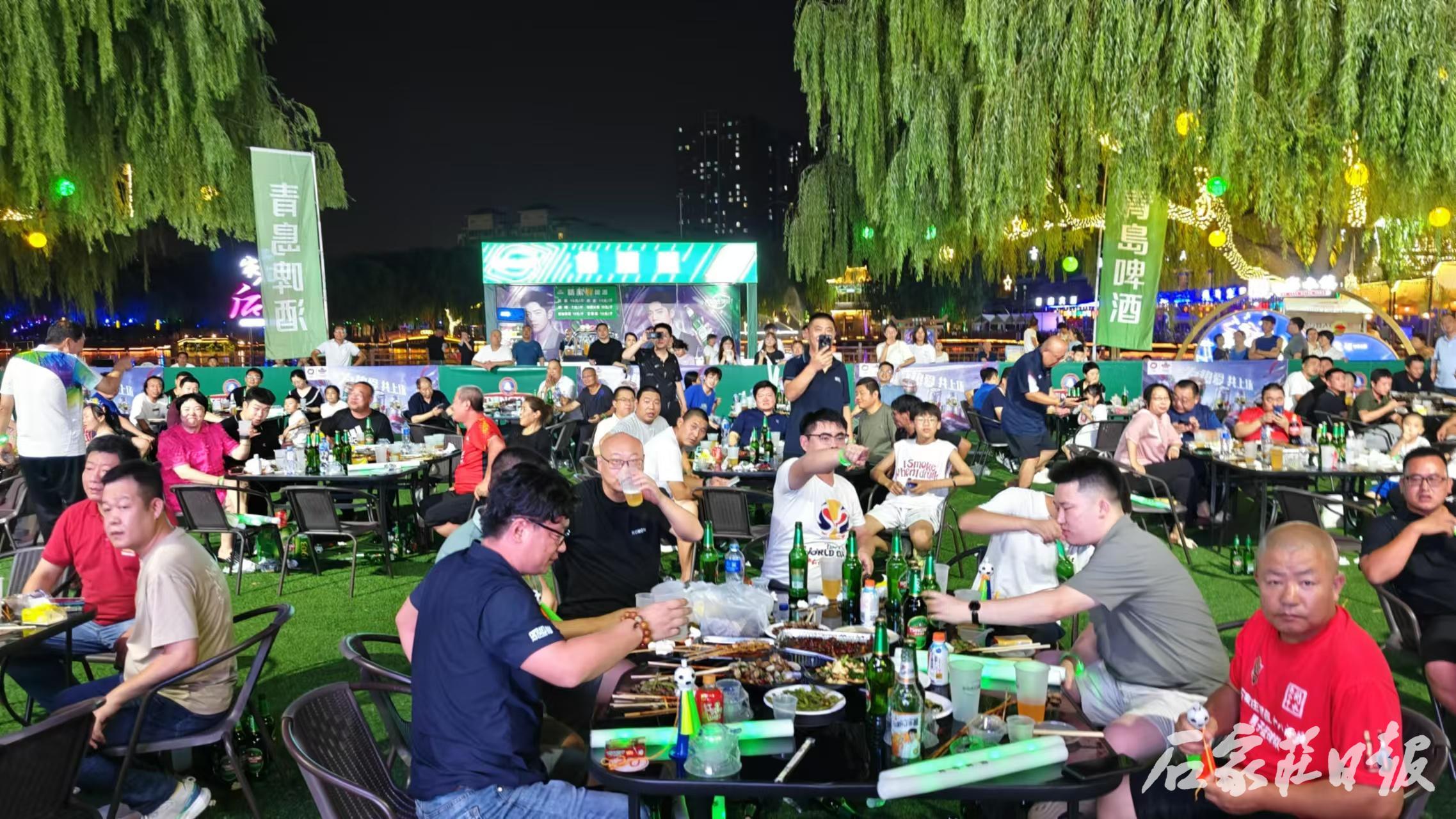 古栾水镇是今年我市国际啤酒节的主会场。每天夜晚,各特色小吃摊前都会排起长队,市民在享受运动乐趣的同时,也不忘来一场舌尖上的狂欢。现场销售的各类美食销量十分可观,其中,精酿啤酒、卤味小菜、美味小吃等尤为热销。“夜经济+体育”的组合业态创造出丰富的夜消费新场景,带来更加多元化的新体验。