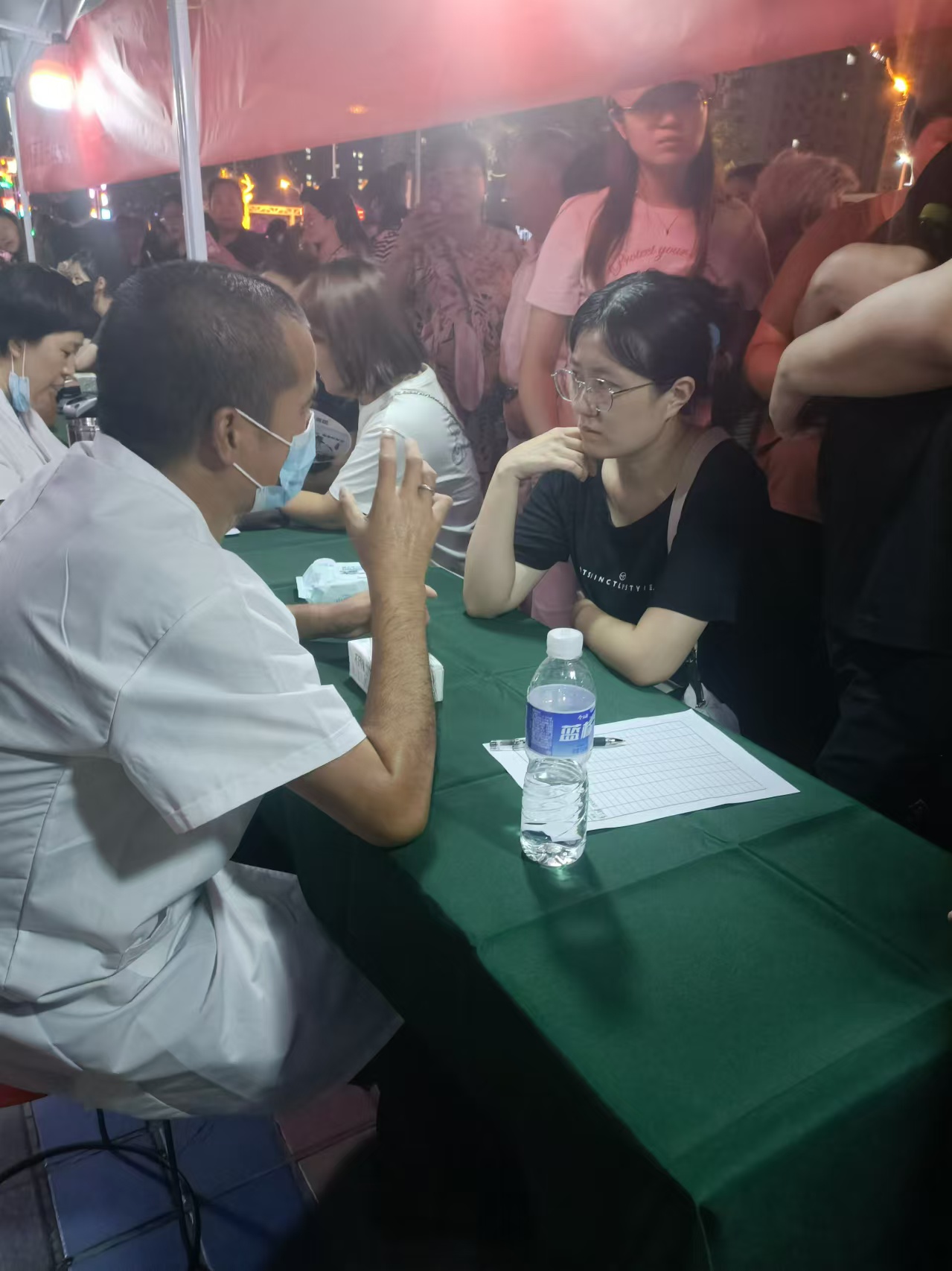 “阿姨,把脉您有肝火,建议多喝水,我们这儿有免费的疏肝明目茶饮,您尝尝!”