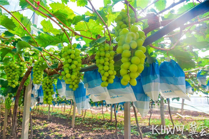 沿着曹前线一路前行,一片采摘园映入眼帘,上百个种植大棚在阳光的折射下熠熠生辉。门口的大仓库里,工作人员正在把一串串刚摘下的葡萄打包装箱。