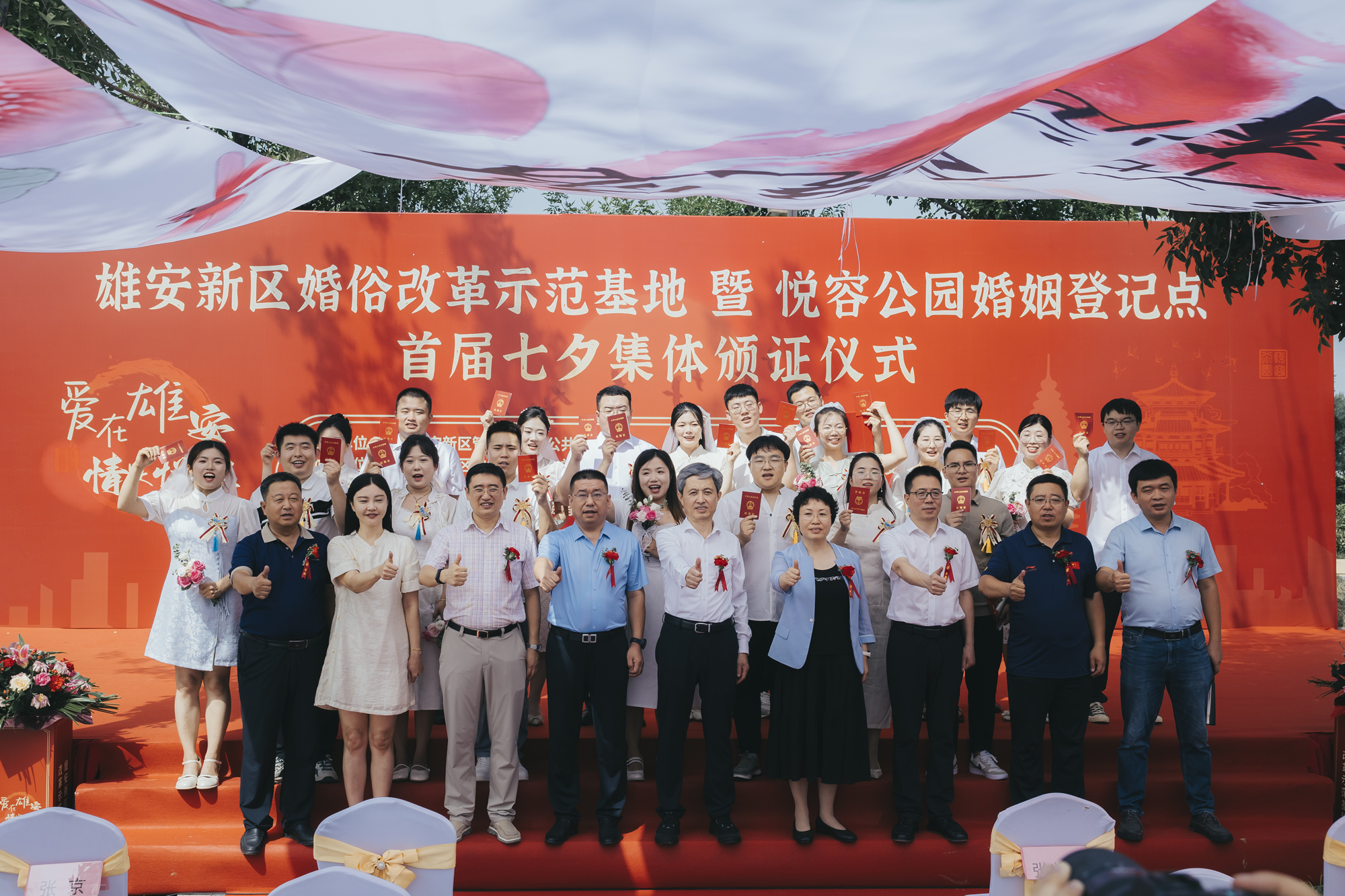 8月10日,在雄安新区悦容公园南苑梅园驿站举办了“雄安新区婚俗改革示范基地落地暨悦容公园婚姻登记点首届集体颁证仪式”,共为16对因建设雄安新区结缘的新人集体颁证,并邀请他们体验新式婚礼、游园活动。