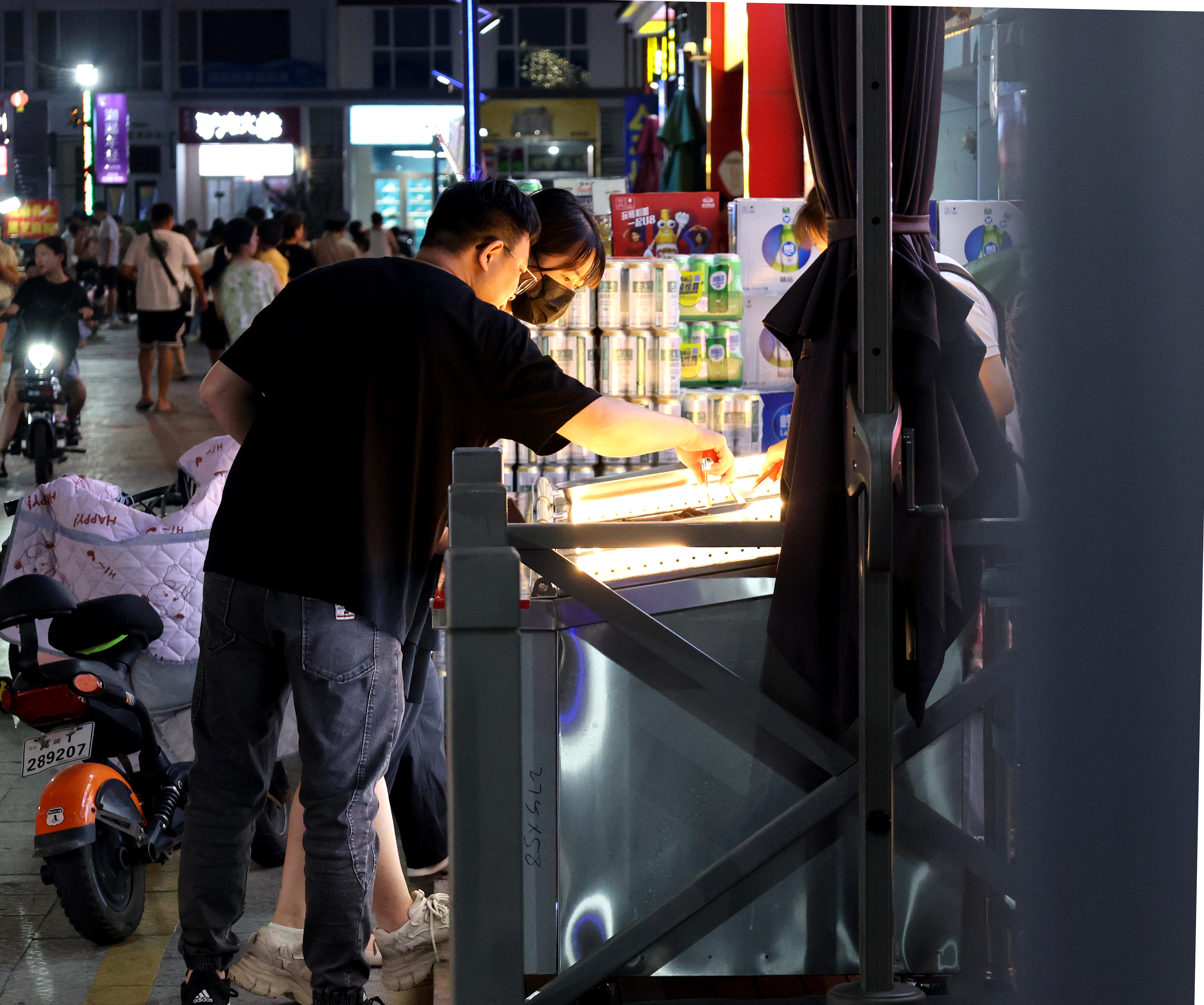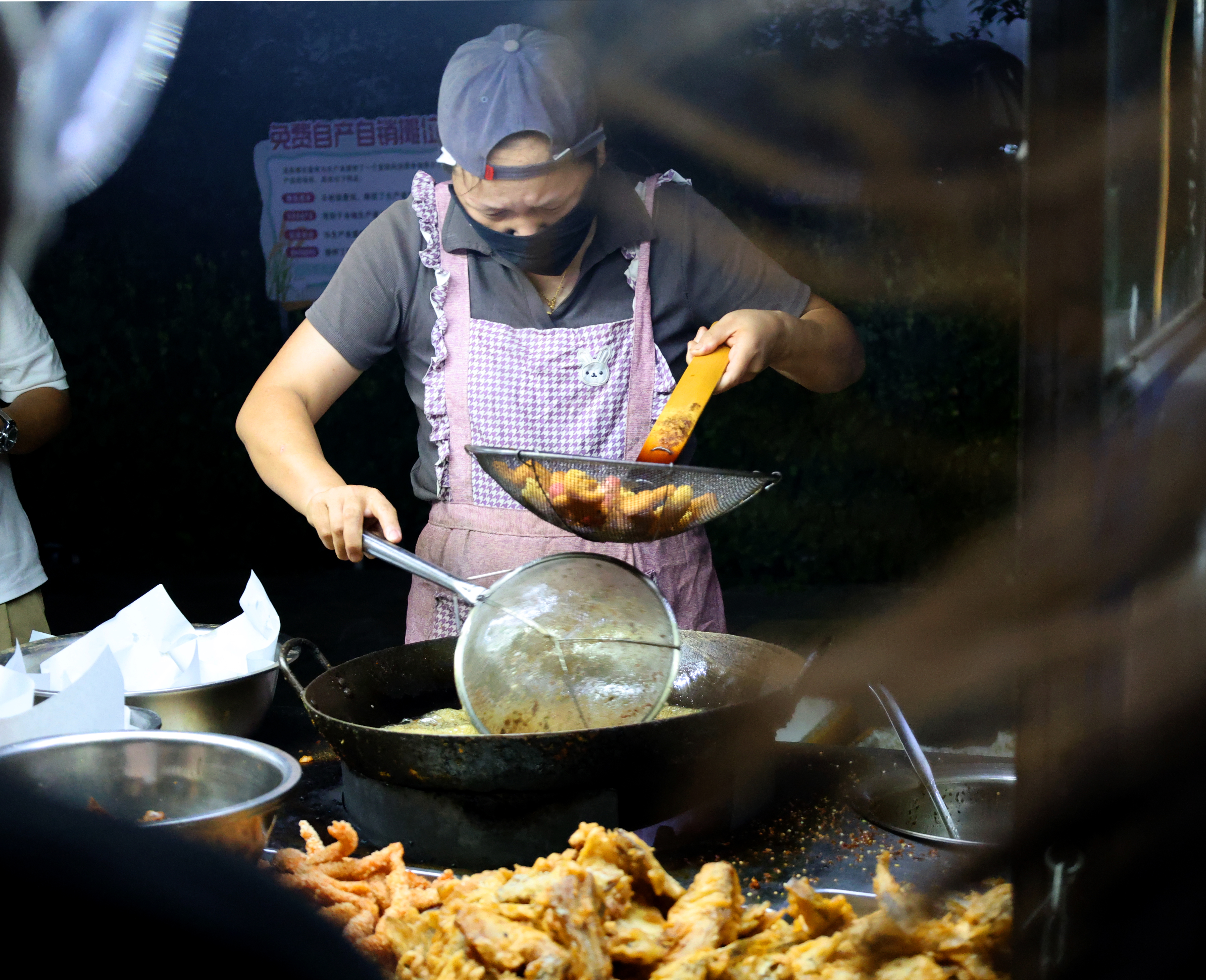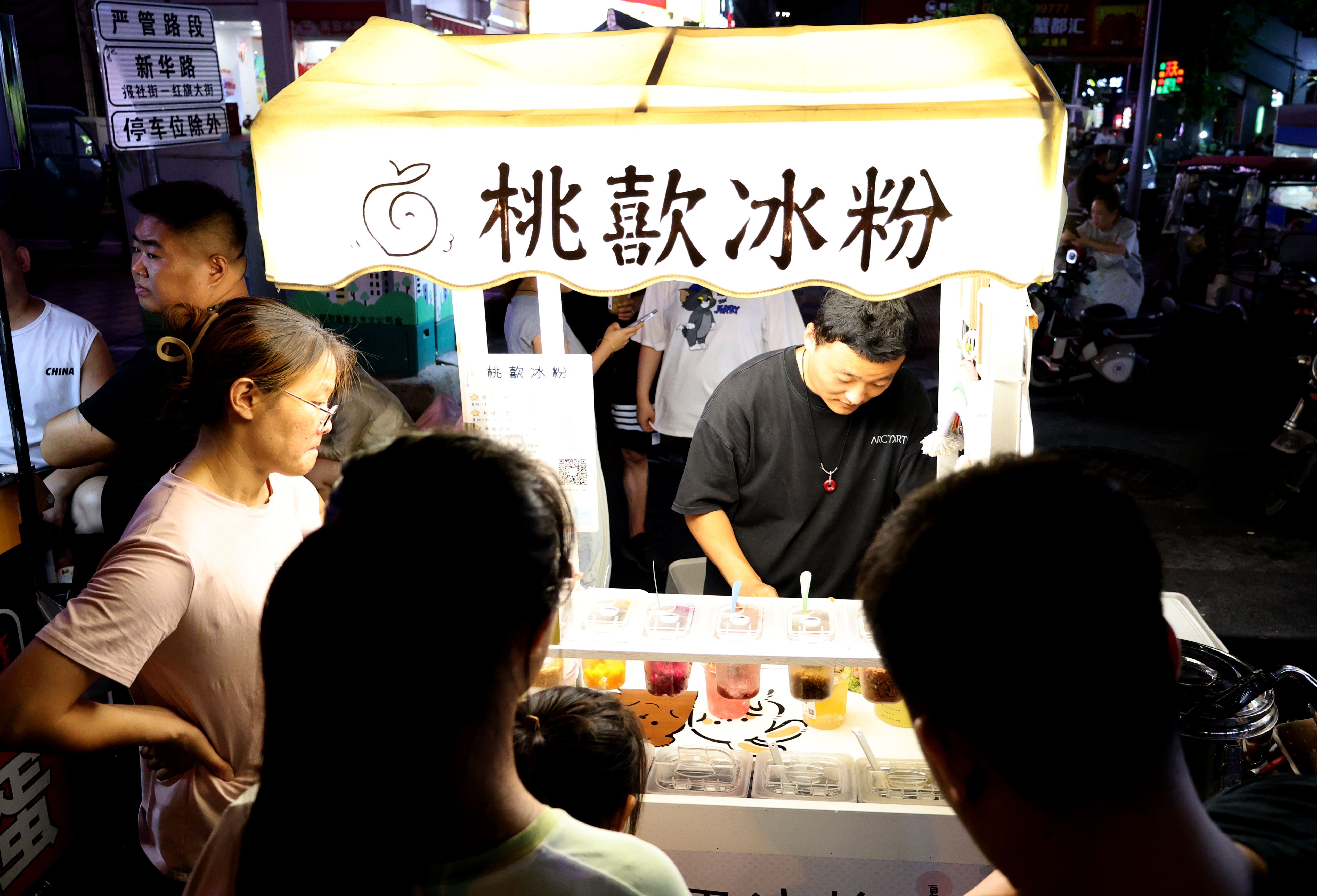 9时,在新华路报社街北头儿的夜市上,诱人的麻辣烫声、香甜的冰粉、香脆的炸鸡……各种美食令人目不暇接,这里美食、衣服、日用杂货、宠物各种商品种类繁多。那边,三家相邻的美甲摊位前都有市民在做美甲。一家水煮麻辣烫的摊位前食客满座,生意火爆,店员一边忙着收拾餐桌,一边热情地招呼顾客坐下。这边,烤串店老板边擦汗边笑着说道:“夏天热,人们不爱在家做饭,出来吃大排档方便又美味,每天我这儿人多着哩!”