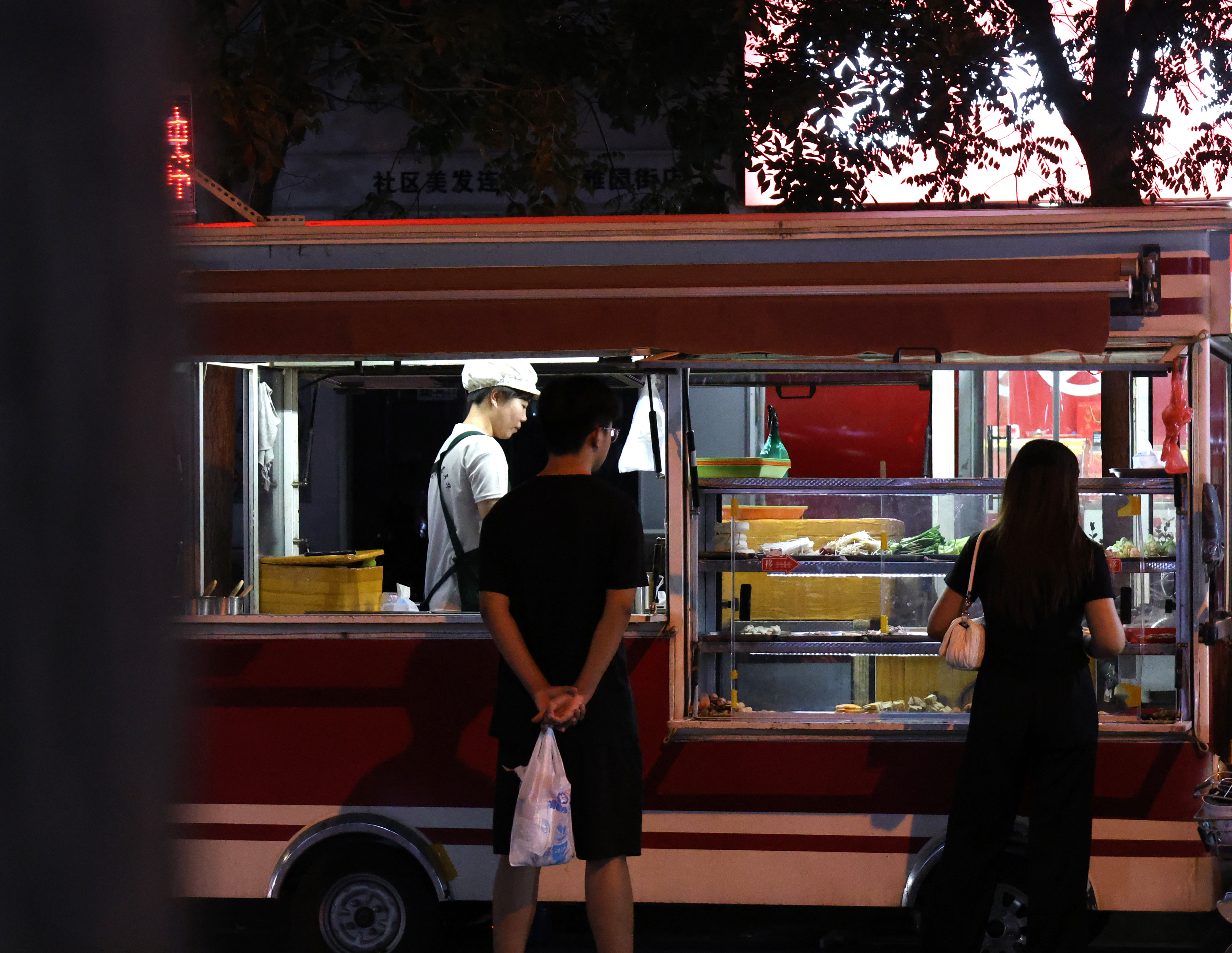 7时40分, 庆丰街上的地摊市场热闹非凡。冒油的烤肉、广东河粉、鲜香酥脆的煎饼果子等各种美食的香气交织弥漫,刺激着人们的味蕾,令人食欲大振。正在品尝美食的王女士兴奋地说:“忙碌一天后来这儿逛逛,尝尝美食,一天的疲惫瞬间消散。”