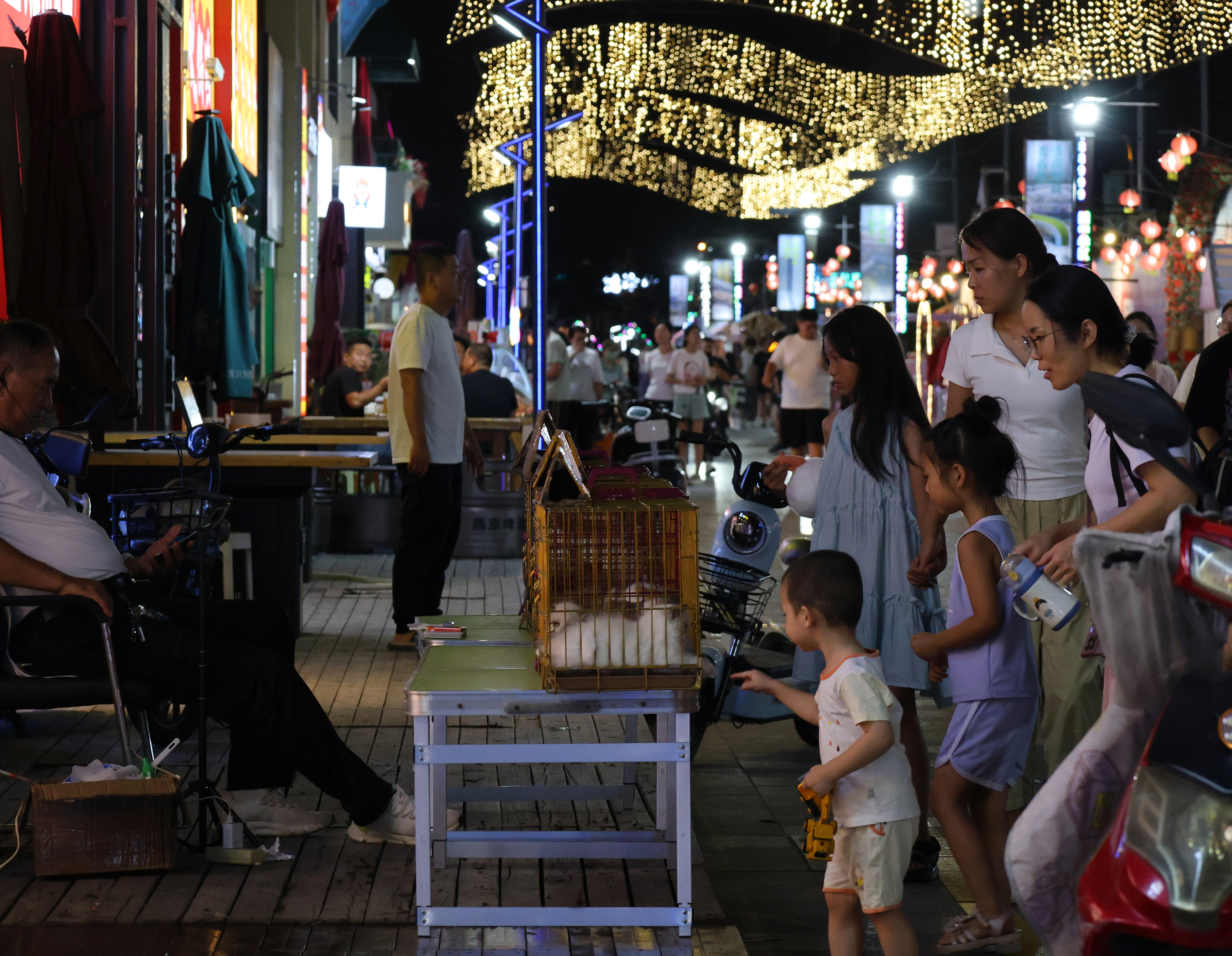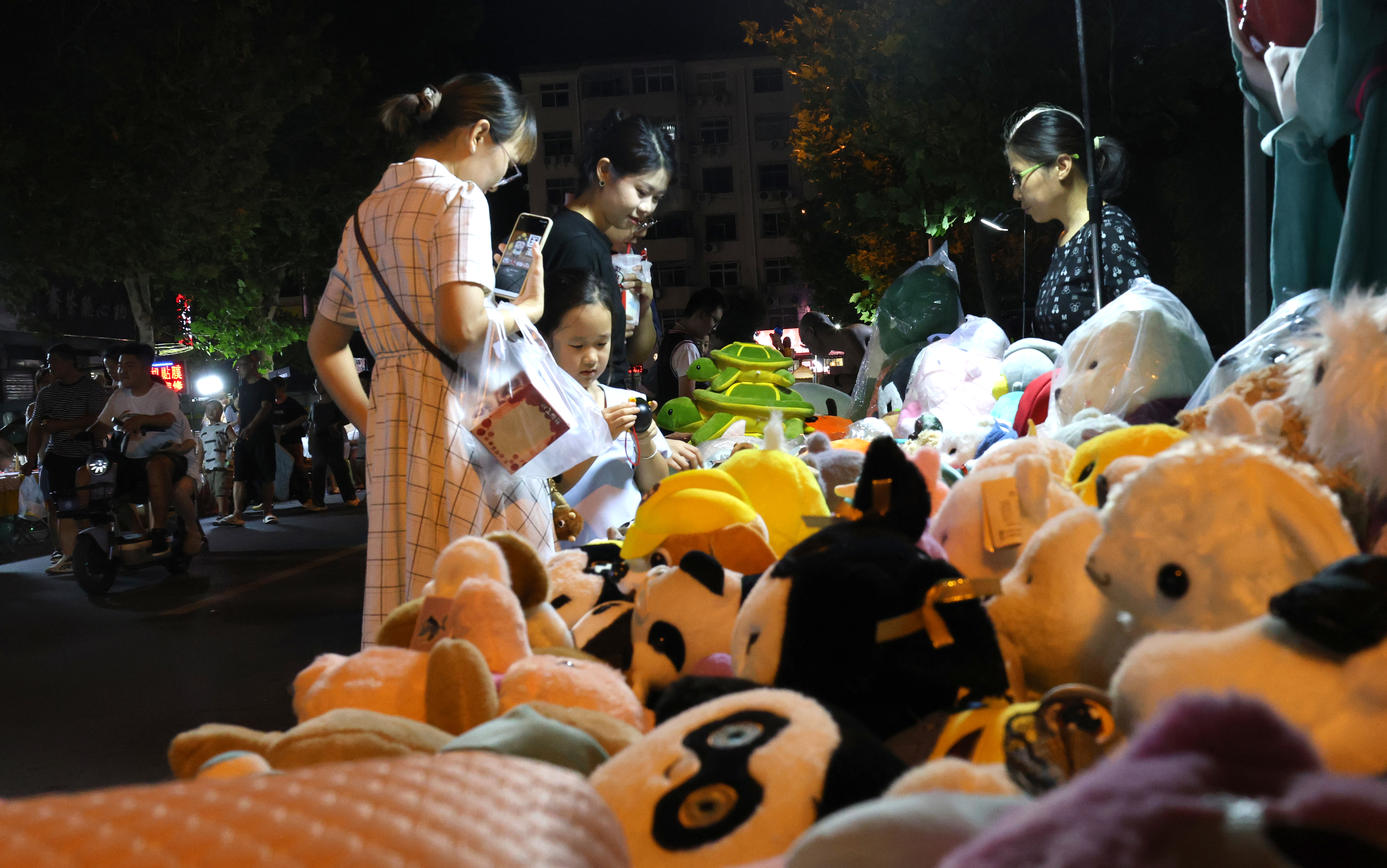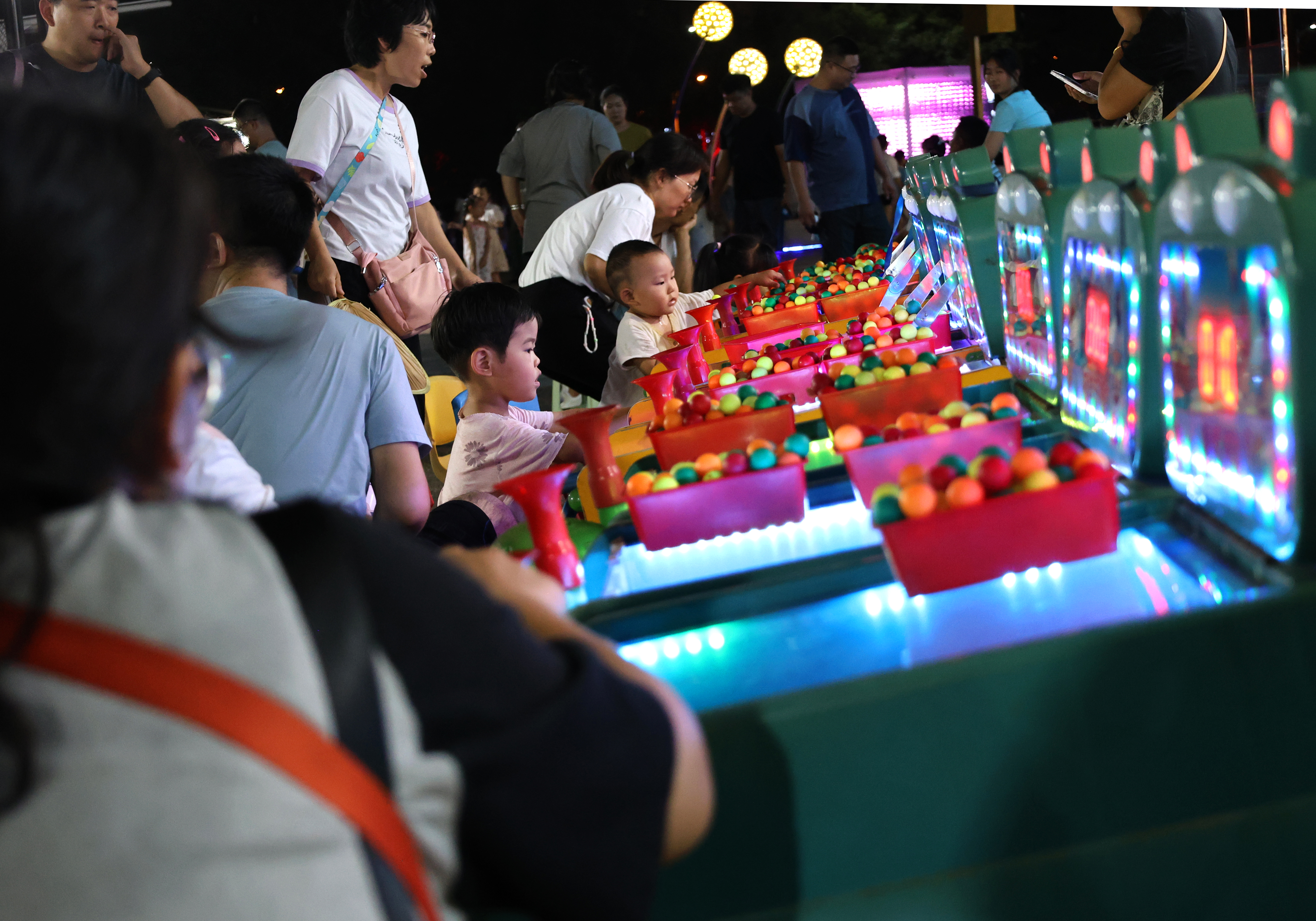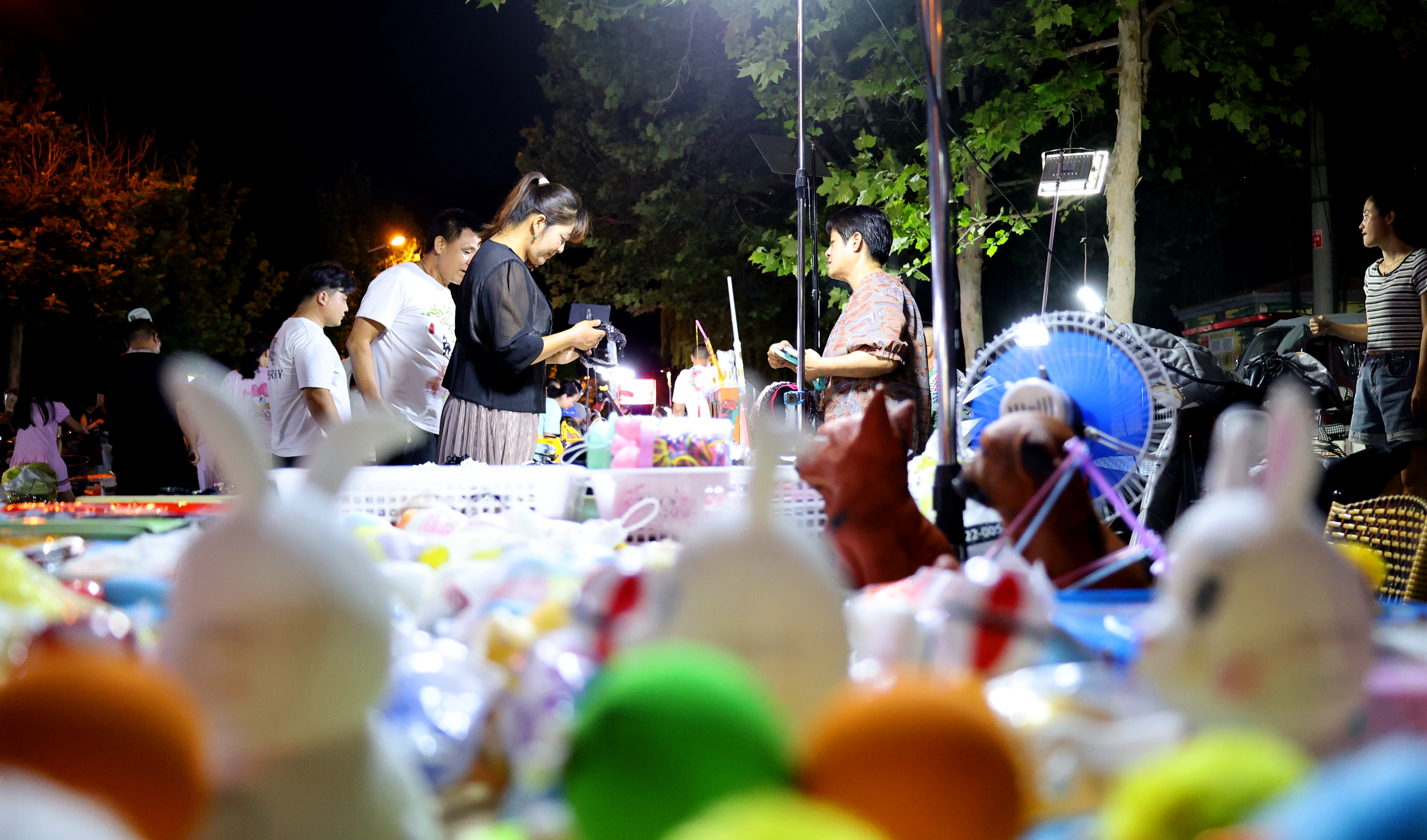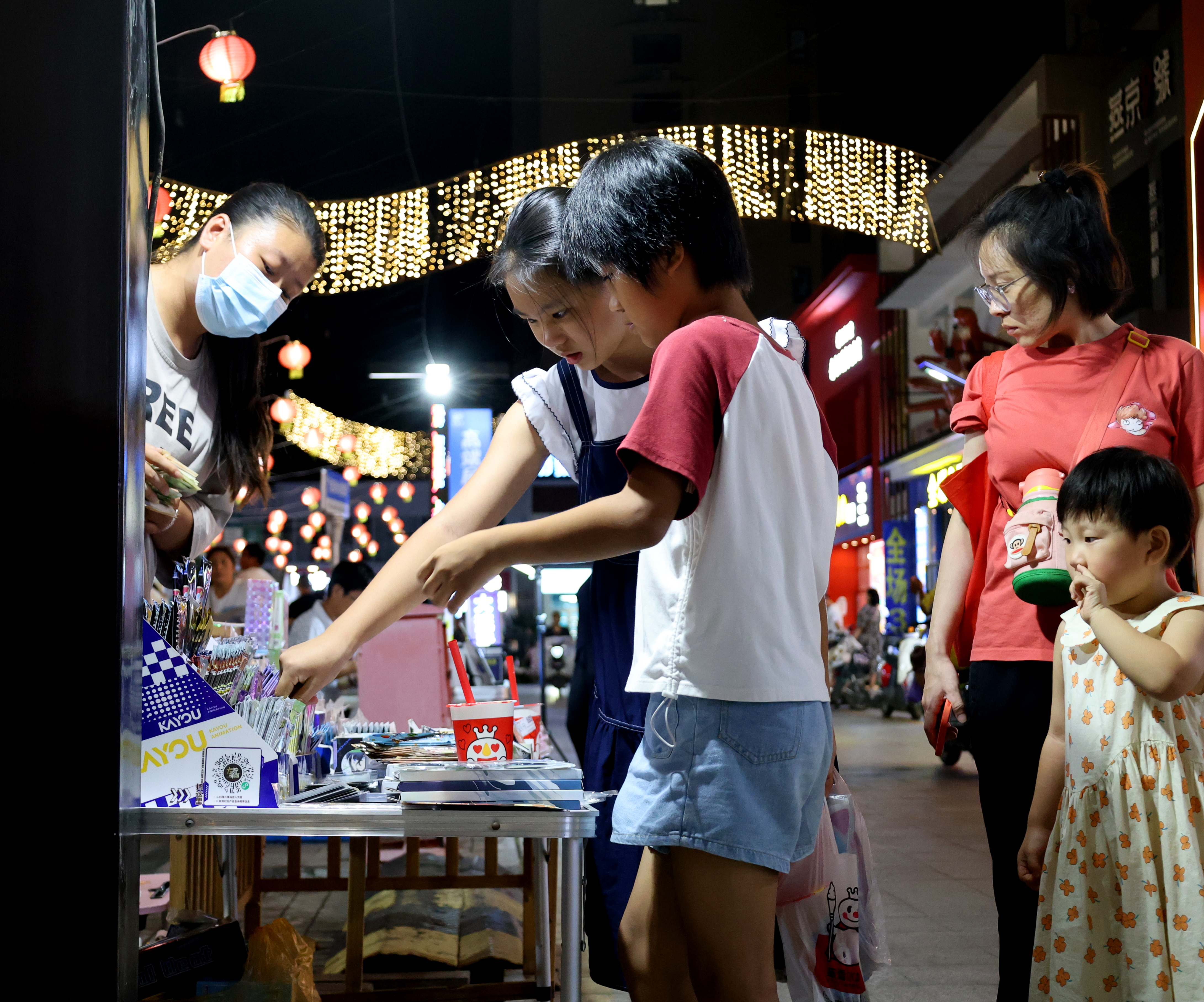 夜市上娱乐项目丰富多彩,套圈、捞鱼、涂石膏娃娃等让市民乐在其中。陪孩子捞鱼的家长刘丹丹说:“孩子放假,天热不想远走,在家门口就能吃喝玩乐,真好。”在一个套圈摊位前,一名小朋友兴奋地比划着要套小熊布偶,引来众多路人围观加油,现场欢乐氛围浓厚。