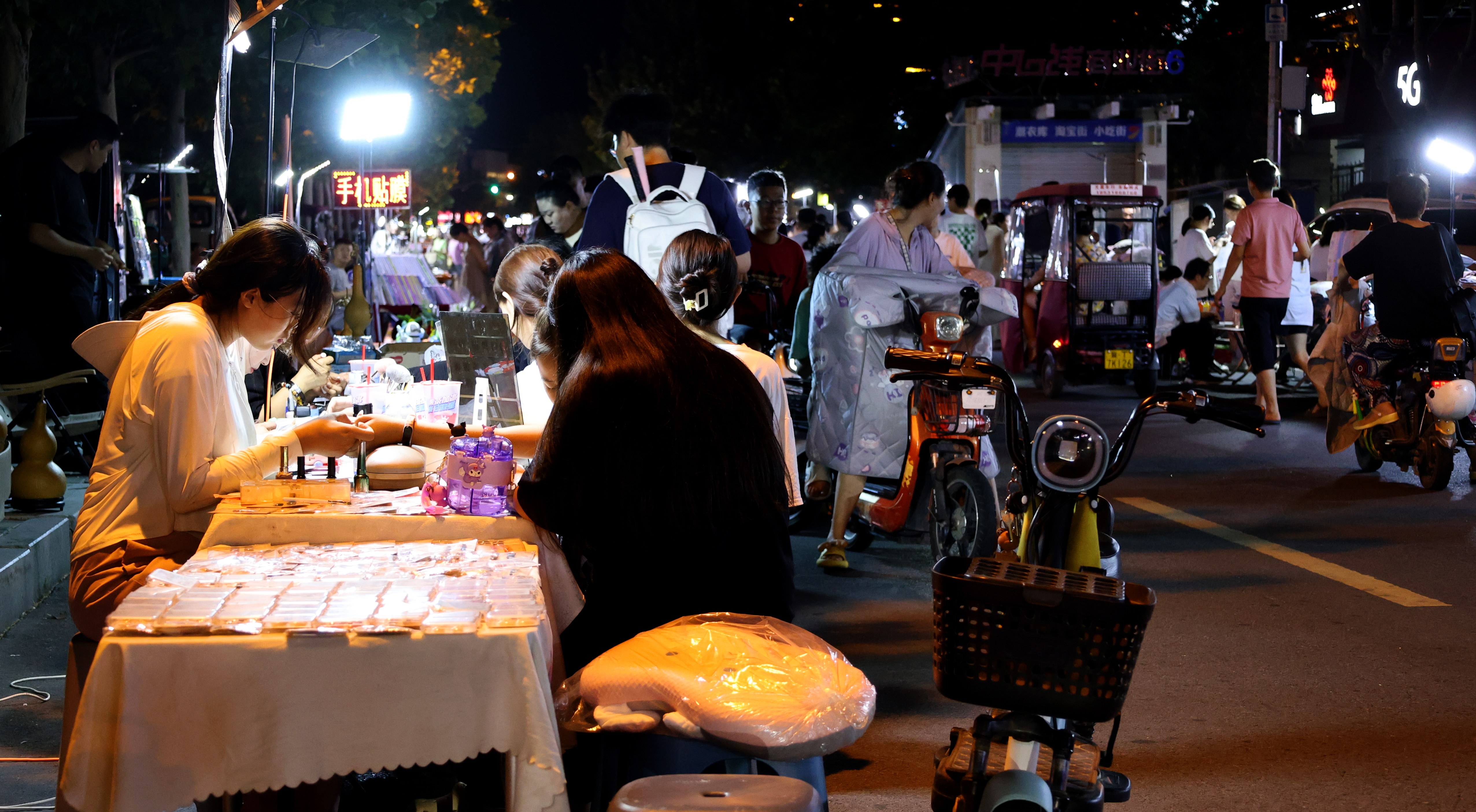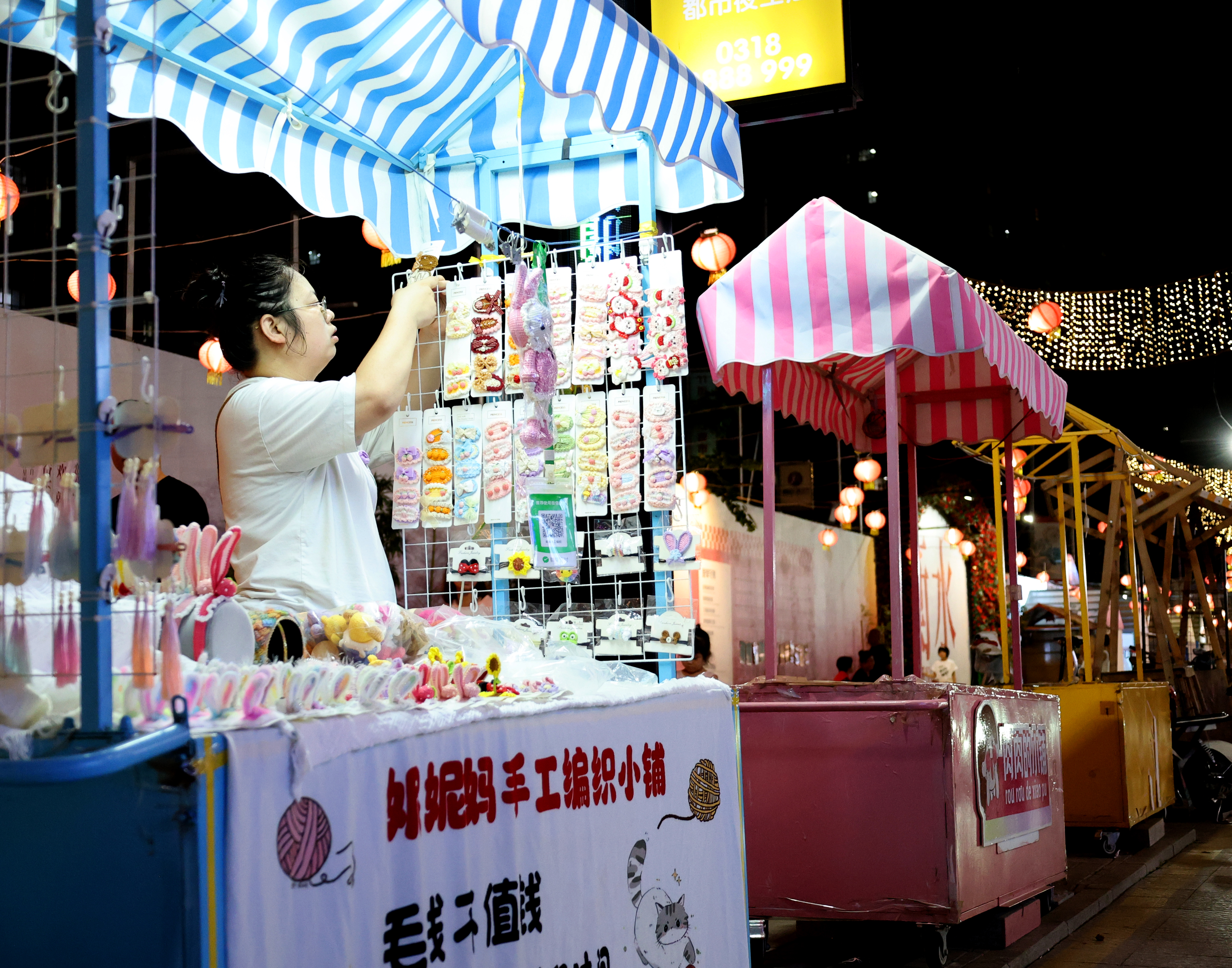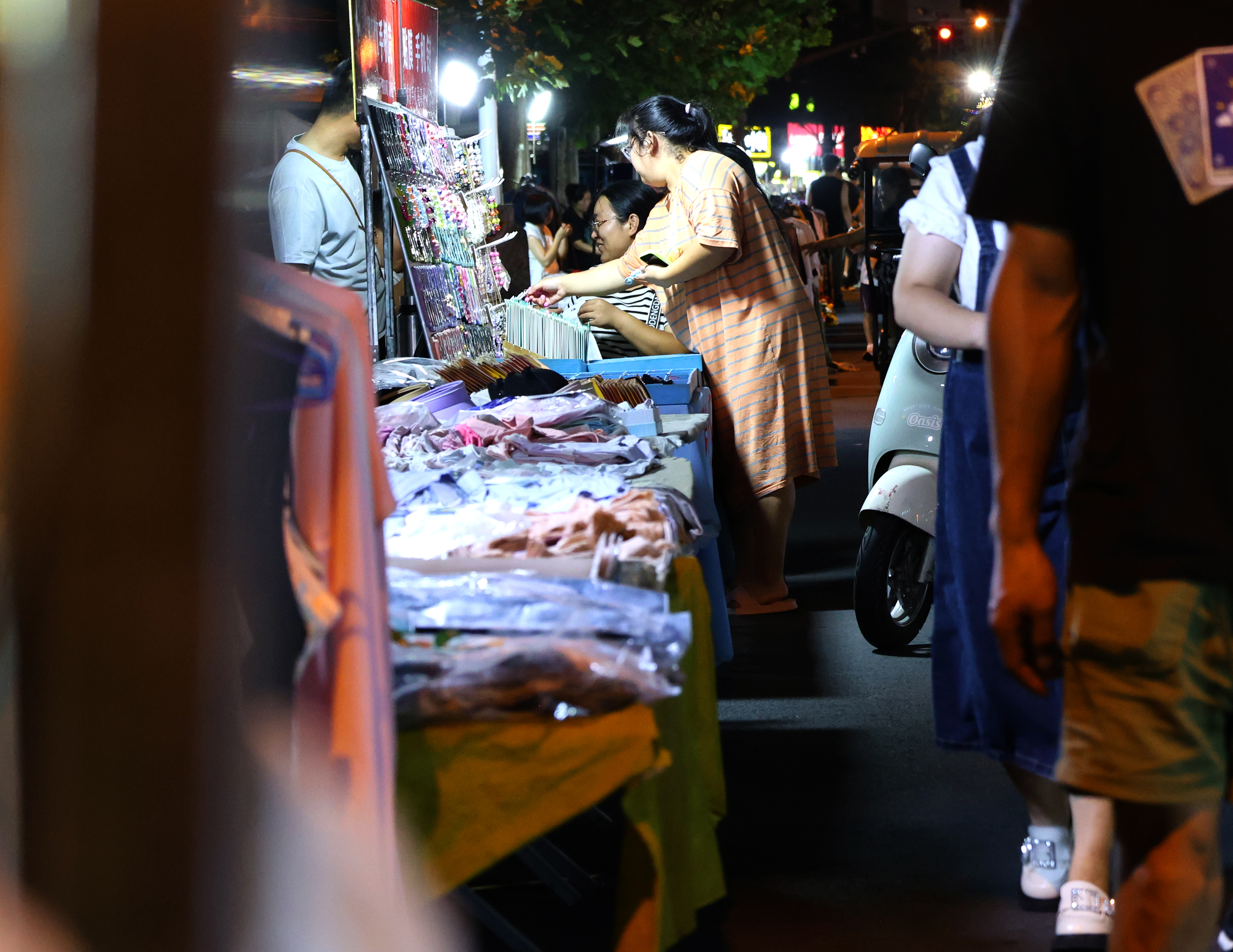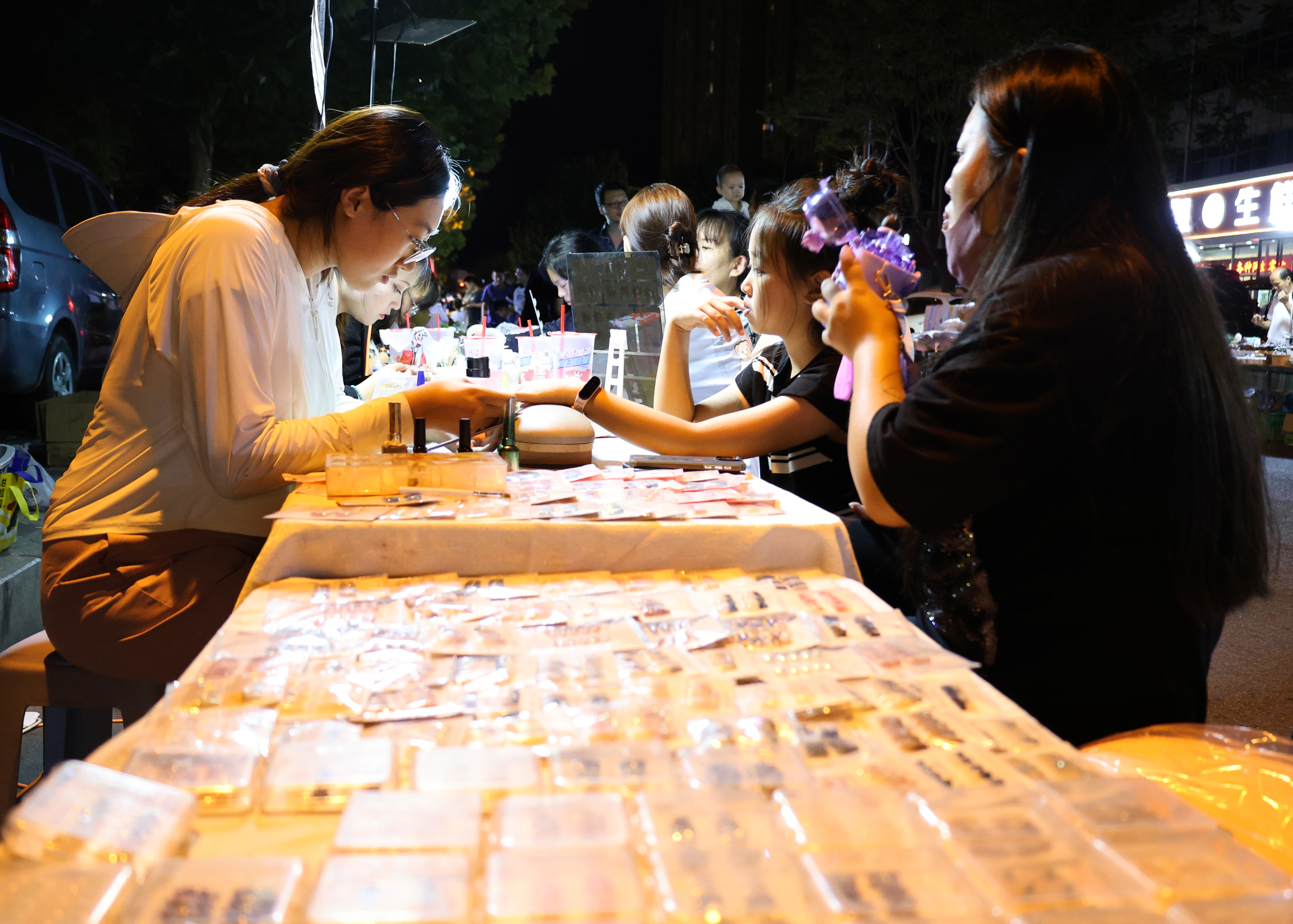在这里,手工编织饰品、文具、美食等商品应有尽有。暑假回家参与社会实践的大学生陈娇娇满心欢喜地说:“生意挺好,每晚能挣七八十块钱。”住在河东的张先生说,自家有手机门店,下班后再来此摆摊贴手机膜,一晚上还能有百八十块的收入。