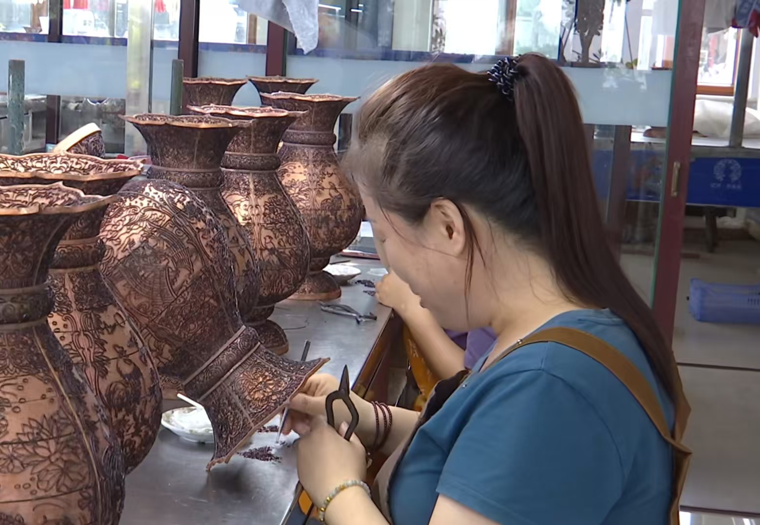 近日,走进饶阳县大官亭镇亿泽景泰蓝工艺品厂车间,一幅繁忙的工作景象。工人们一手拿镊子,一手扶铜胚,按照设计好的图形将铜丝粘在铜胚上。设计、掐丝、点蓝、打磨、镀金……每一道工序都分工明确、精益求精。经过工人的一双巧手加工,精美的图案在景泰蓝瓶的瓶身上呈现出来。工人程二宝说:“我们的工作挺好的,离家很近。在‘家门口’就业,既有工作收入又能照顾家里。”