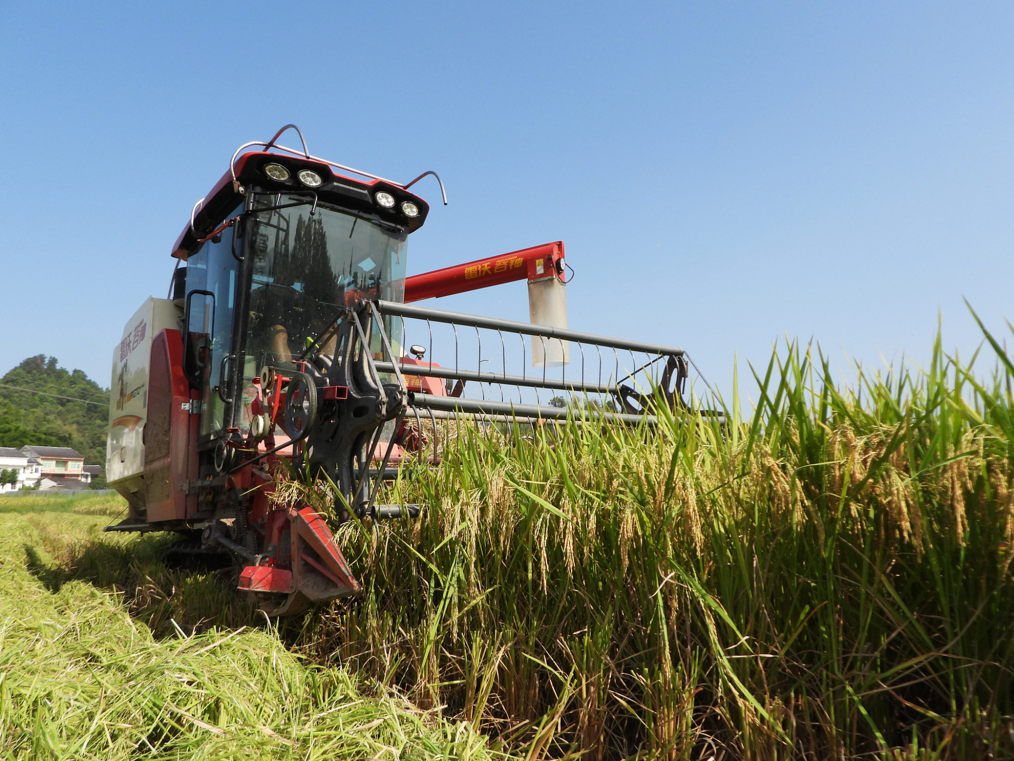 四川省达州市村民驾驶收割机收获水稻