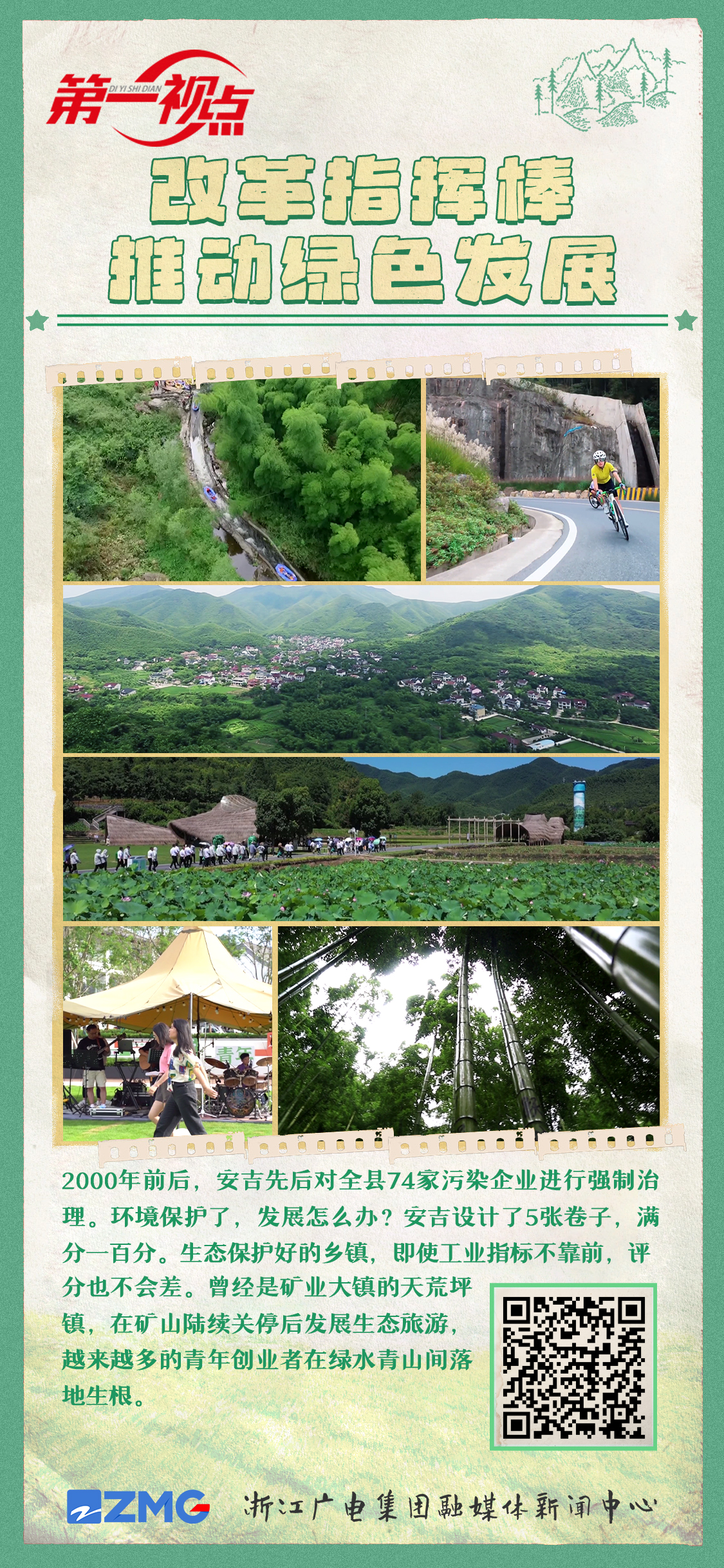 丽水在全国率先探索生态系统生产总值GEP核算,打通绿水青山向金山银山的转化通道;安吉设计了5张卷子,满分一百分。生态保护好的乡镇,即使工业指标不靠前,评分也不会差。指挥棒这么一改,曾经是矿业大镇的天荒坪镇,在矿山陆续关停后发展生态旅游,“借景生财”。刚刚建成的环山绿道,把天荒坪镇的四五个村串珠成链。大伙组建联盟,抱团成立了旅游管委会,办起了“青来集”创业基地……吸引了越来越多的青年创业者在绿水青山间落地生根。