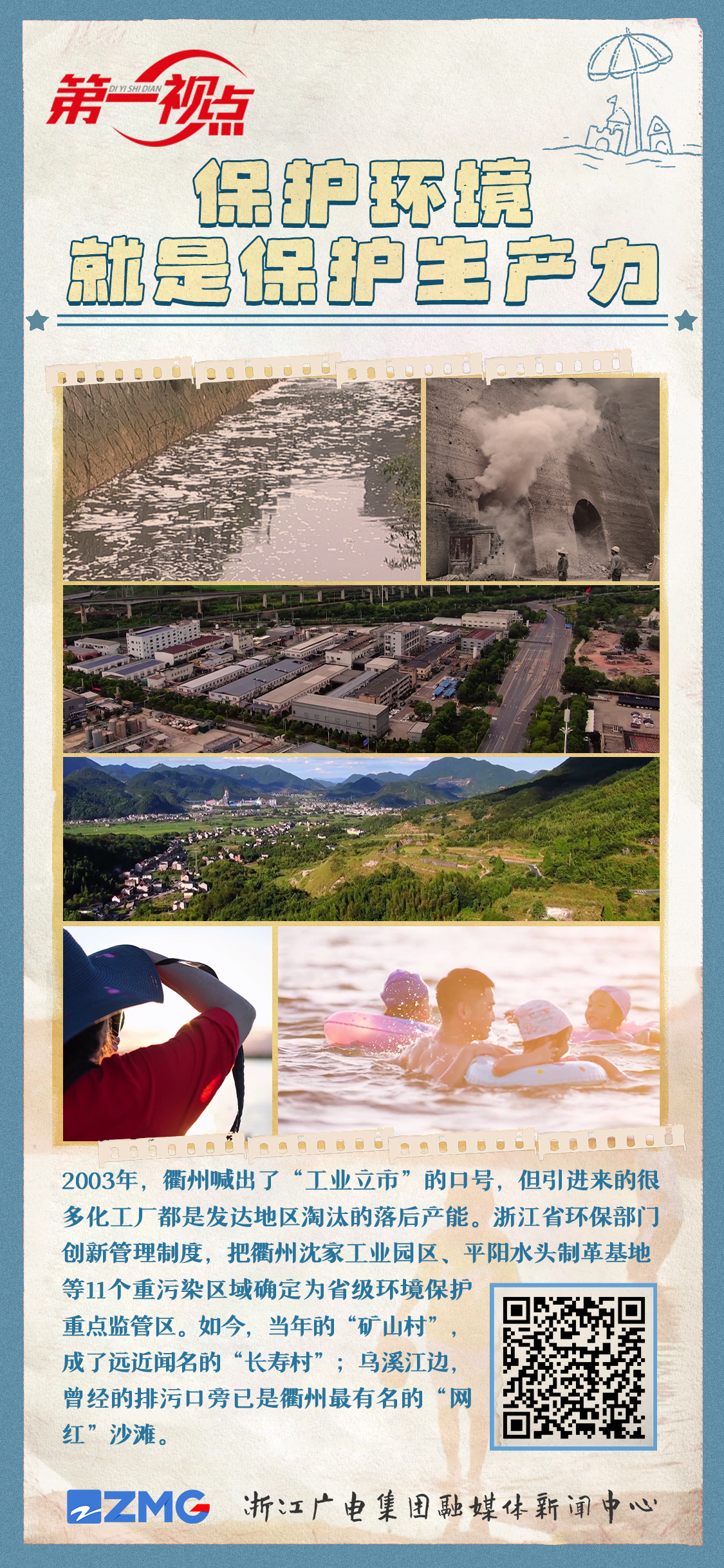 为了迎接今年的生态日,柴子峰又回到了当年的矿区,筹备即将到来的“美丽衢州”摄影展。当年的“矿山村”,成了远近闻名的“长寿村”。虽然他和很多老百姓一样,都说不清什么叫“改革”,但眼前乌溪江边,曾经的排污口旁已是衢州最有名的“网红”沙滩,夕阳下人们戏水消暑的惬意,早已说明了一切。