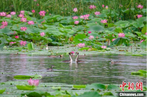 作为东亚—澳大利西亚候鸟迁徙路线上的重要驿站,河北衡水湖国家级自然保护区是重要的栖息地和繁殖地。自今年3月以来,春夏繁殖期已近尾声,已有40余种夏候鸟在衡水湖繁育后代上万只。衡水湖位于河北省衡水市,是华北平原保持沼泽、水域、滩涂、草甸和林地等完整湿地生态系统的国家级自然保护区,享有“京津冀最美湿地”“东亚蓝宝石”等美誉。近年来,经过系列保护修复,衡水湖生态环境明显改善,今年6月入选河北省首批六个“鸟类天堂”之一,有鸟类334种。此外,衡水湖植物资源也非常丰富,达594种。图为8月14日,成年凤头鸊鷉带领幼鸟在衡水湖栖息觅食。陈康 摄