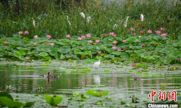 作为东亚—澳大利西亚候鸟迁徙路线上的重要驿站,河北衡水湖国家级自然保护区是重要的栖息地和繁殖地。自今年3月以来,春夏繁殖期已近尾声,已有40余种夏候鸟在衡水湖繁育后代上万只。衡水湖位于河北省衡水市,是华北平原保持沼泽、水域、滩涂、草甸和林地等完整湿地生态系统的国家级自然保护区,享有“京津冀最美湿地”“东亚蓝宝石”等美誉。近年来,经过系列保护修复,衡水湖生态环境明显改善,今年6月入选河北省首批六个“鸟类天堂”之一,有鸟类334种。此外,衡水湖植物资源也非常丰富,达594种。图为8月14日,在衡水湖,凤头鸊鷉带着幼鸟游过,和一只今年出生的小白鹭互相观望。陈康 摄