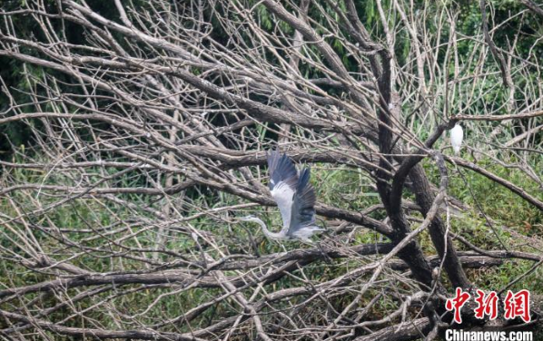 作为东亚—澳大利西亚候鸟迁徙路线上的重要驿站,河北衡水湖国家级自然保护区是重要的栖息地和繁殖地。自今年3月以来,春夏繁殖期已近尾声,已有40余种夏候鸟在衡水湖繁育后代上万只。衡水湖位于河北省衡水市,是华北平原保持沼泽、水域、滩涂、草甸和林地等完整湿地生态系统的国家级自然保护区,享有“京津冀最美湿地”“东亚蓝宝石”等美誉。近年来,经过系列保护修复,衡水湖生态环境明显改善,今年6月入选河北省首批六个“鸟类天堂”之一,有鸟类334种。此外,衡水湖植物资源也非常丰富,达594种。图为8月14日,一只快要成年的小苍鹭在衡水湖鸟岛枝头振翅欲飞。陈康 摄