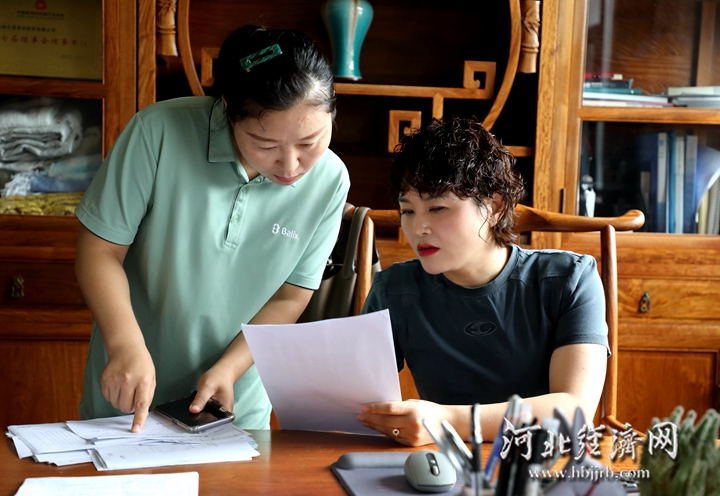 柏立信总经理刘红(右)在了解原材料供应情况。河北经济日报记者 烟成群 摄