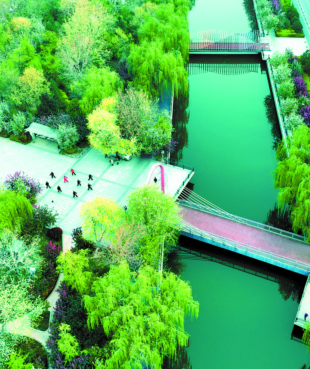 清晨,市民在绿树成荫的民心河沿线运动场所健身,城市活力尽显。