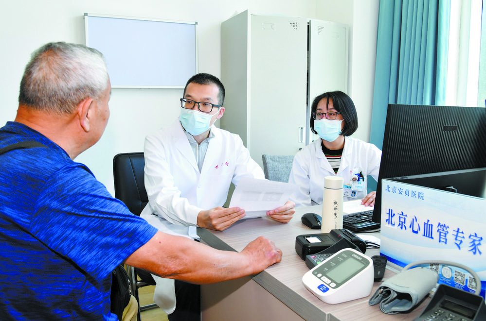 在石家庄市第三医院,来自北京安贞医院的心血管专家张明多(中)为患者进行诊断。