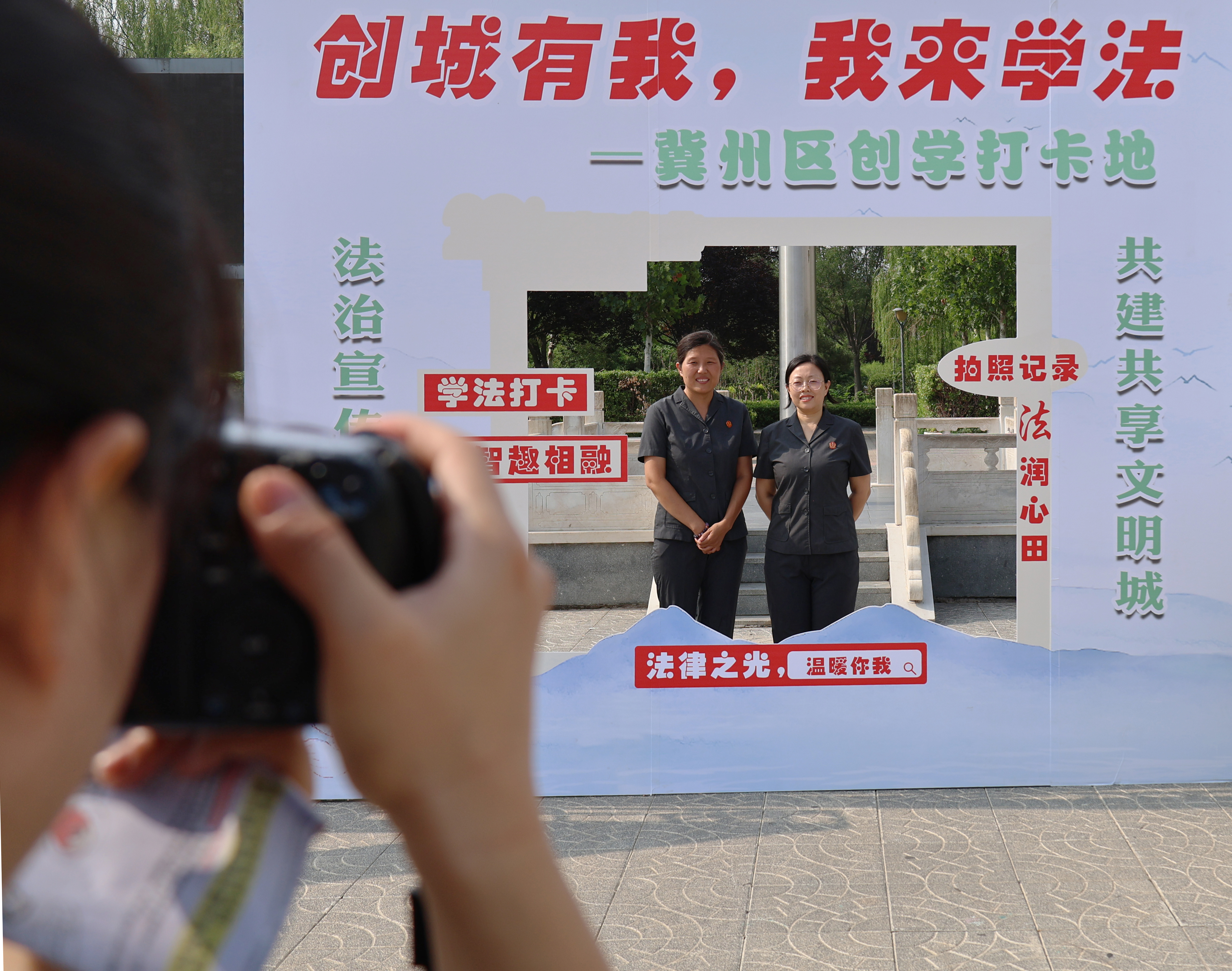 其中,“创城有我,我来学法”创学打卡地成为一道亮丽的“风景线”。这一创意区域将法治知识与趣味互动完美融合,居民们纷纷在特制的法治宣传背景板前拍照留念,在欢乐中铭记学习法治的精彩瞬间,让法治观念悄然深入人心。