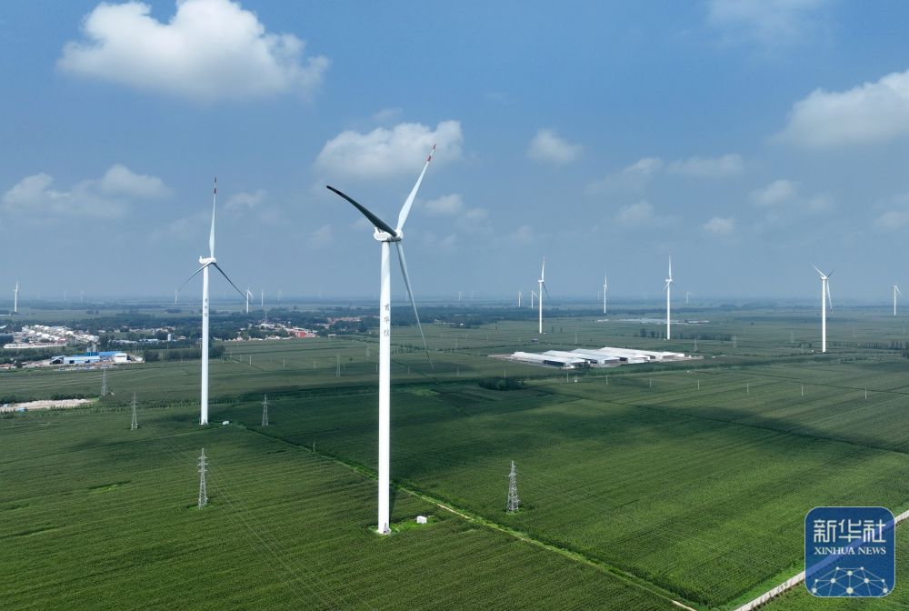 ↑8月21日拍摄的河北省衡水市故城县三朗镇韩庄村附近的风电场(无人机照片)。