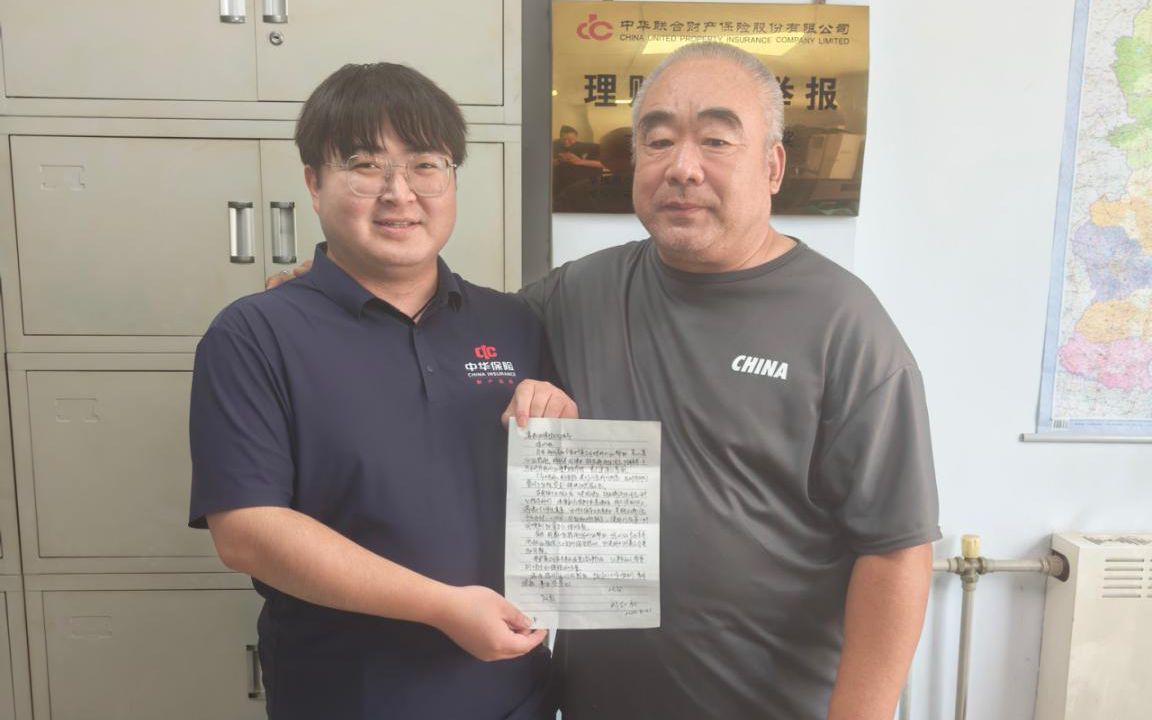8月21日,伤者家属刘某来到中华财险衡水中支,专程为公司查勘员周继业、人伤岗胡亚涛送来亲笔书写的感谢信,信中充分表达了他对工作人员尽职、热心、专业服务的感激之情,并对公司处理案件的时效性给予了高度认可。