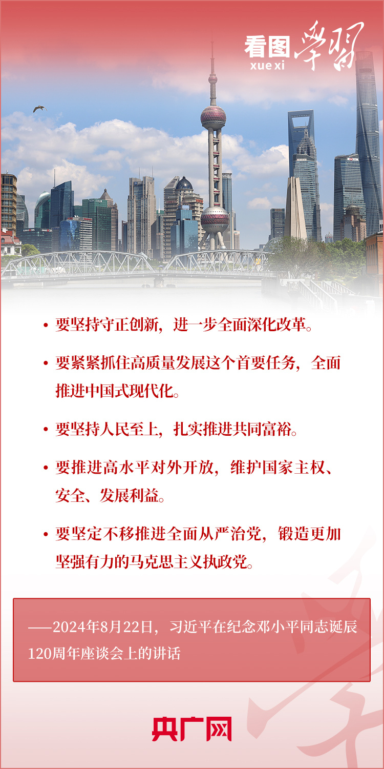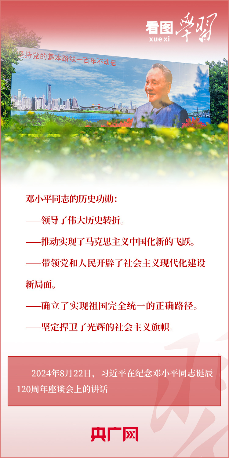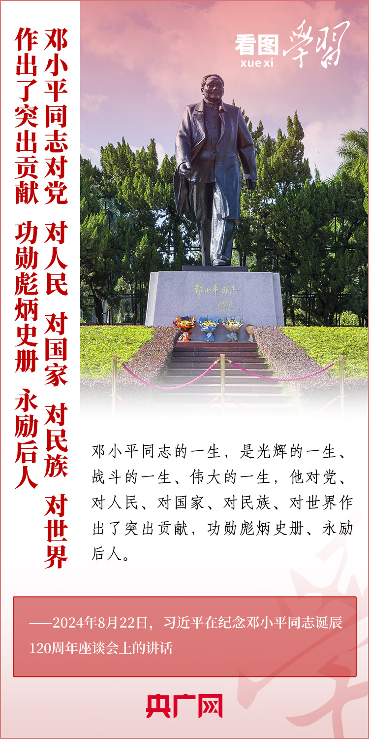 8月22日,习近平总书记在纪念邓小平同志诞辰120周年座谈会上发表重要讲话指出,邓小平同志的历史功勋是全方位的、开创性的,对中国和世界的影响是深刻的、长远的。总书记强调,对邓小平同志最好的纪念,就是把他开创的中国特色社会主义事业继续推向前进。我们要紧紧围绕以中国式现代化全面推进强国建设、民族复兴伟业这个中心任务,继往开来,奋发进取。一起来学习!