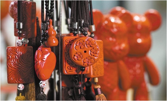 朱江设计制作的适合年轻人的雕漆配饰(6月5日摄)图片来源 新华社