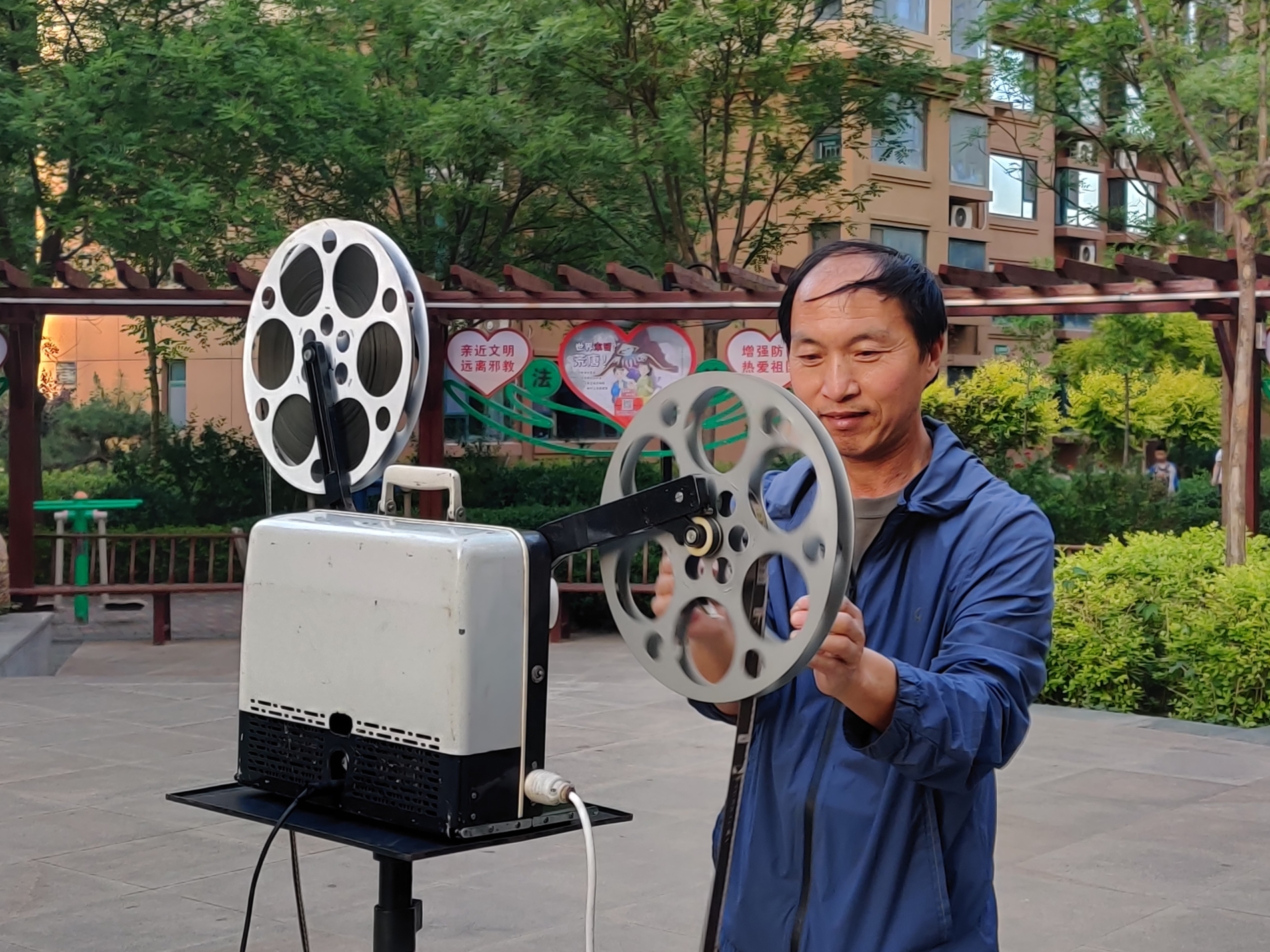 机器、胶片、支杆、线缆等放映设备加起来得有四百多斤重,每次需要搬着七八个箱子去做公益放映。每次放映,至少需要携带两台放映设备。一套数字高清放映机,另一套是四五十斤重的胶片放映机。相对于数字放映机,胶片放映机的操作更为繁琐——架设大约需要1个小时,放映时每20分钟更换一卷胶片。每次,刘显富忙得满头大汗,却乐在其中,“看到大伙儿其乐融融围坐赏片的和谐场景,我觉得所有辛苦都值了。而且每次都有社区工作人员跑前跑后给帮忙,很让人感动。”