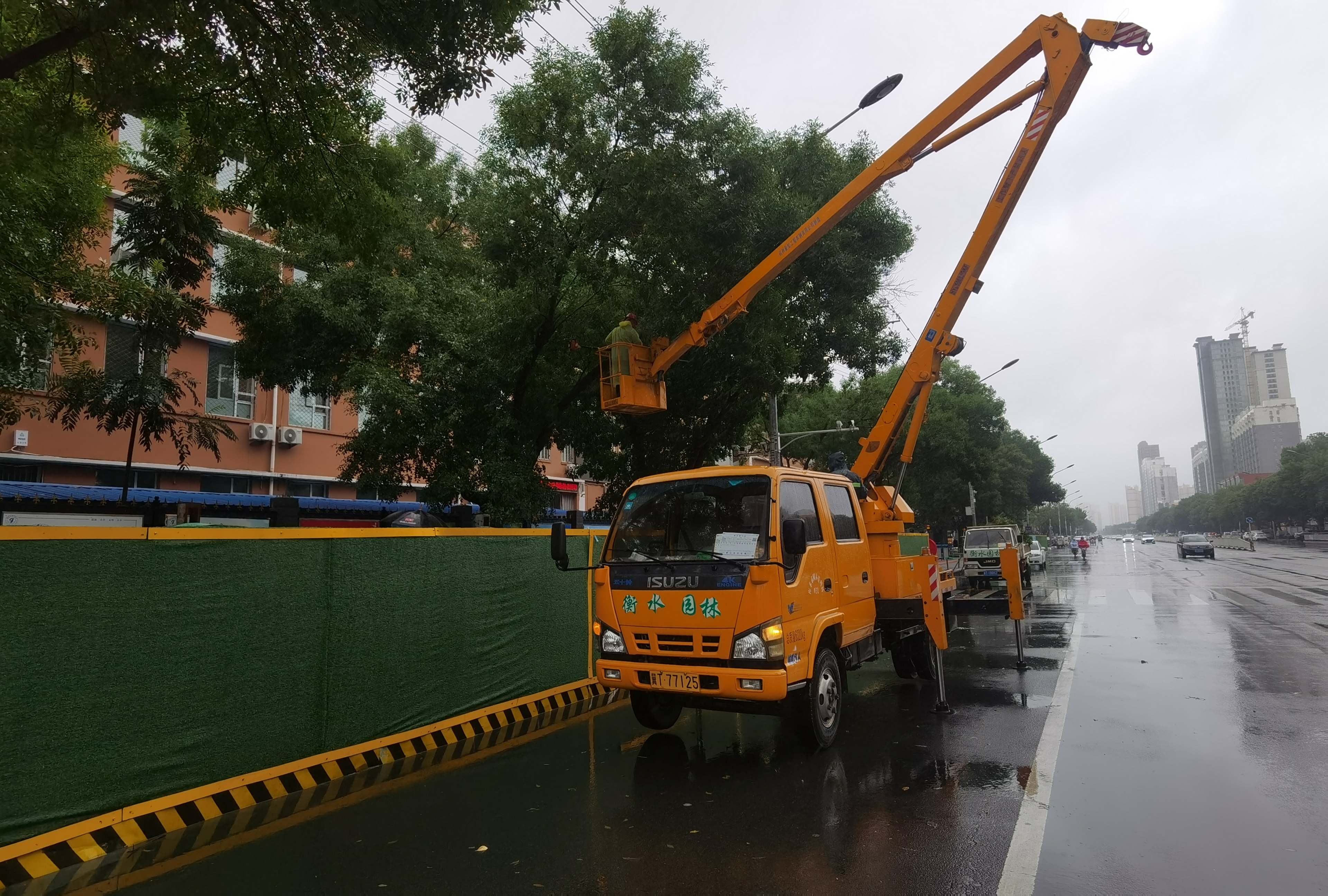 受强降雨影响,衡水主城区个别道路出现了不同程度的行道树倒伏、树枝折断等情况,影响了车辆及行人正常通行,存在安全隐患。雨情就是命令。衡水市园林中心工作人员闻“雨”而动,调配运输车、高空作业车等车辆,带着提前准备的抽水泵、雨衣、雨鞋、沙袋、铁锹等物资,积极投入到应急抢险工作中。清理行道树折枝、处理树木倒伏、疏通公园排水管道……降雨中,工作人员毫不畏缩,抢险排患工作有条不紊。