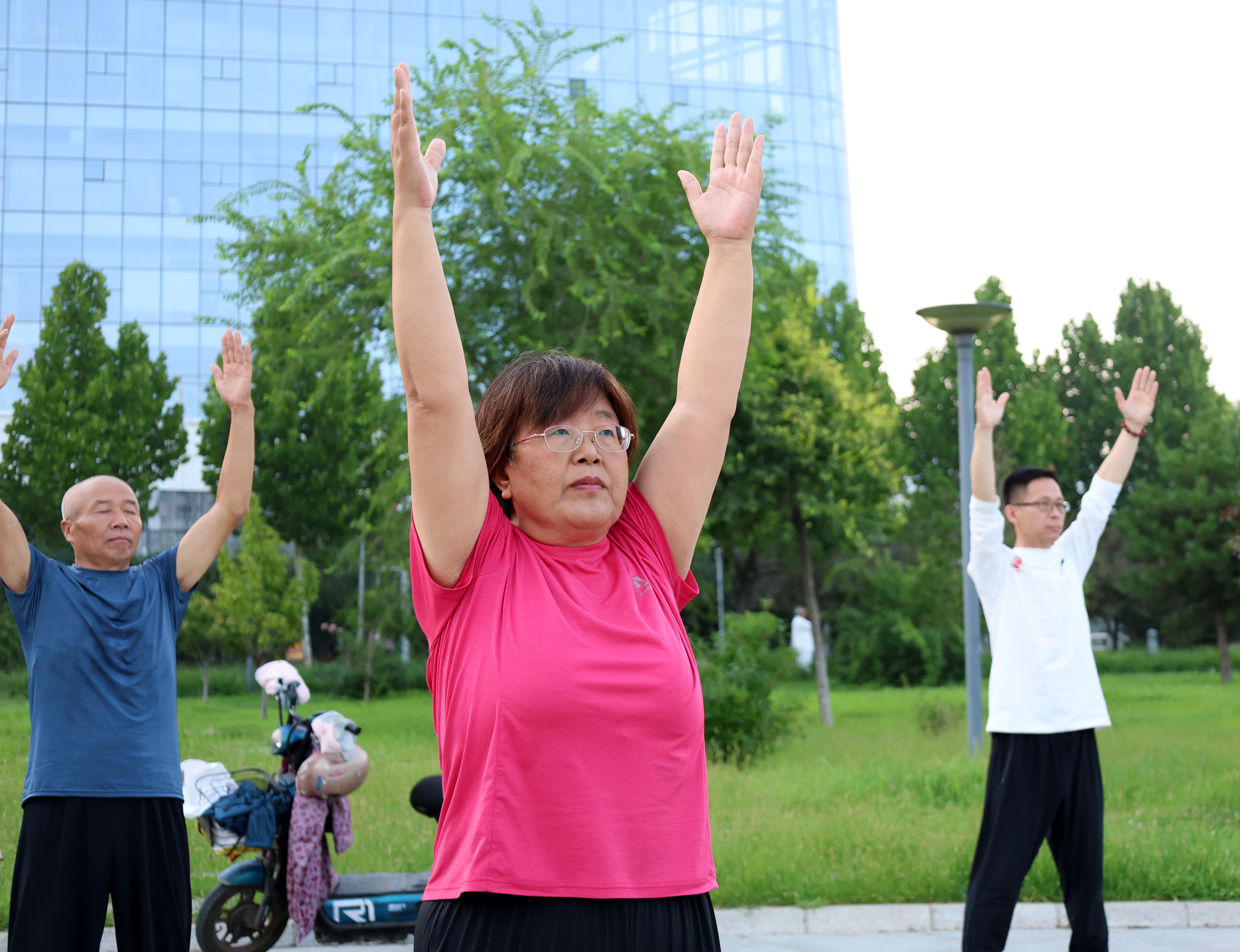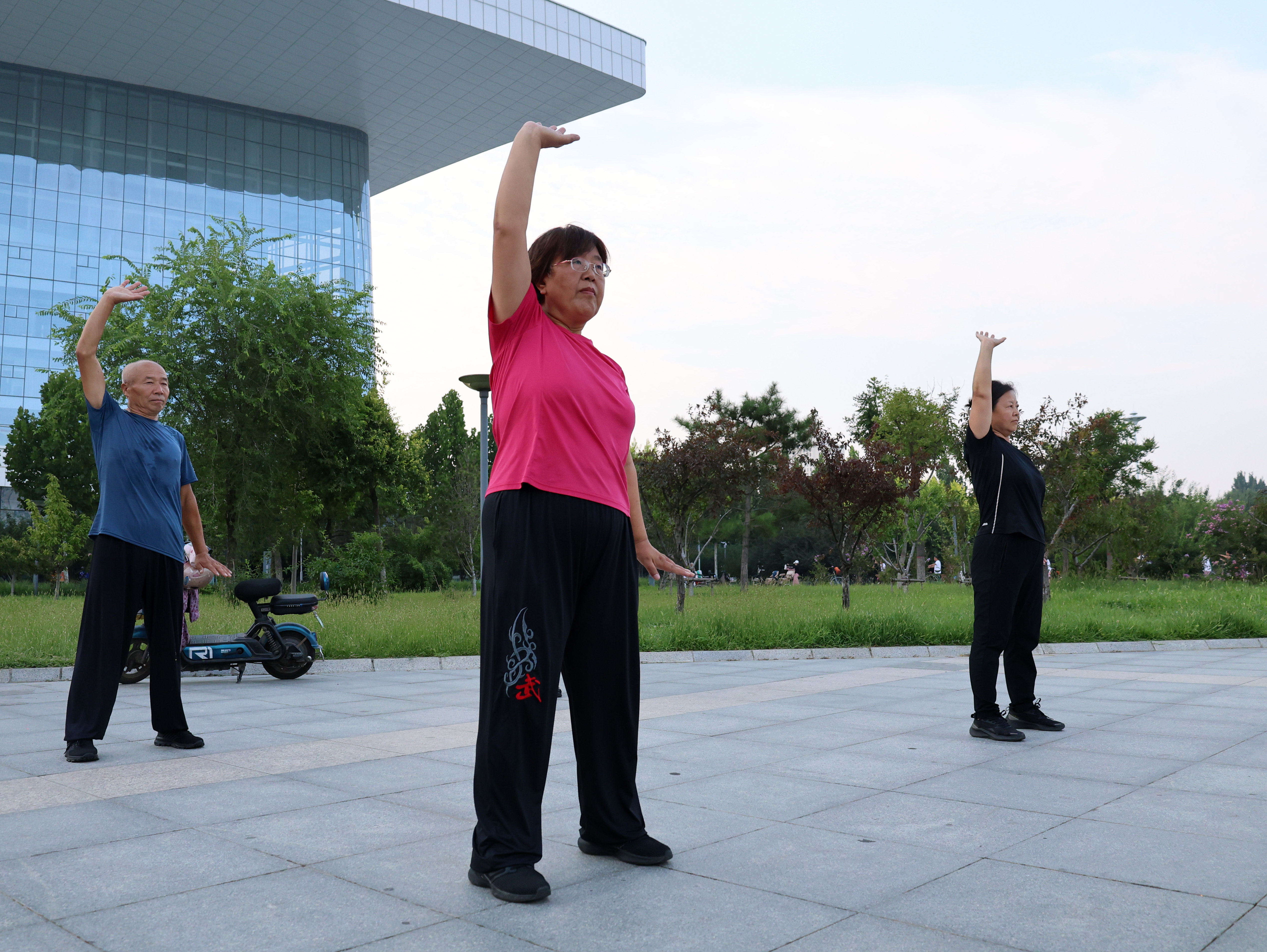 “两手托天理三焦,左右开弓似射雕,调理脾胃须单举,五劳七伤往后瞧……”8月23日,在衡水市区九州广场上,一群精神矍铄的老人正舒缓地练习八段锦,队伍最前端的盛淑玲格外引人注目。她的动作松静自然,一招一式都充满着无限张力。