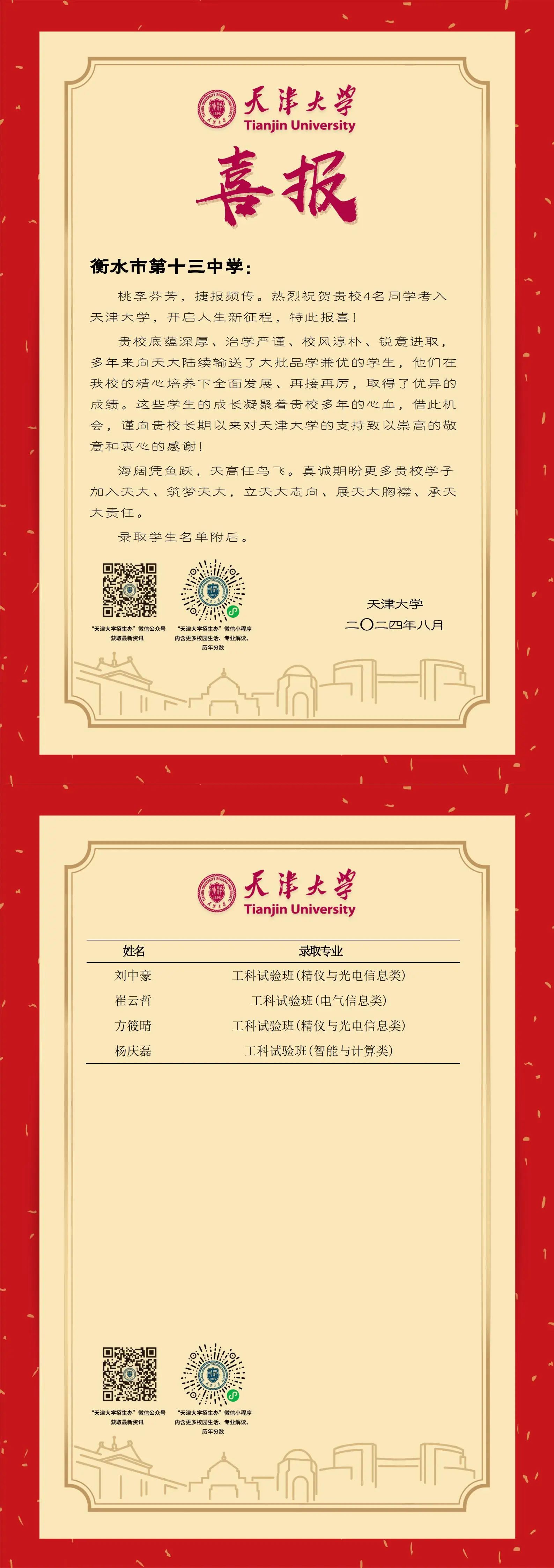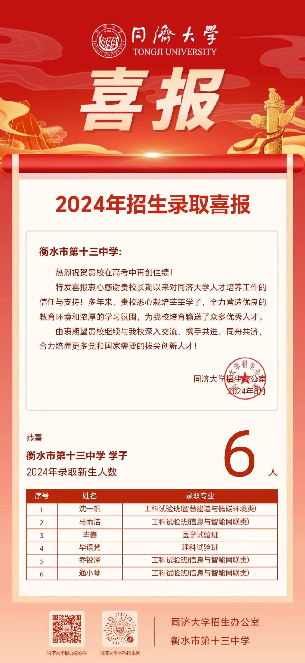 喜讯连连,荣耀绽放!衡水十三中众多优秀学子凭借卓越的实力与不懈的努力,成功叩开了985、211等学府的大门,这不仅是对他们个人奋斗的最好肯定,更是对衡水十三中卓越教育质量的有力证明。一封封来自985、211高校的喜报也频频传来,这为衡水十三中这片孕育梦想的沃土再次播撒下了希望与荣耀的种子。让我们一同见证这份荣耀,期待更加辉煌的未来!
