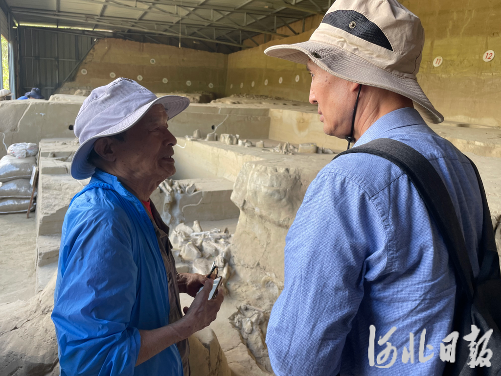 8月21日,参加泥河湾科学发现100周年国际学术研讨会的专家学者来到石沟遗址参观考察。图为两位学者在交流。河北日报记者魏雨摄