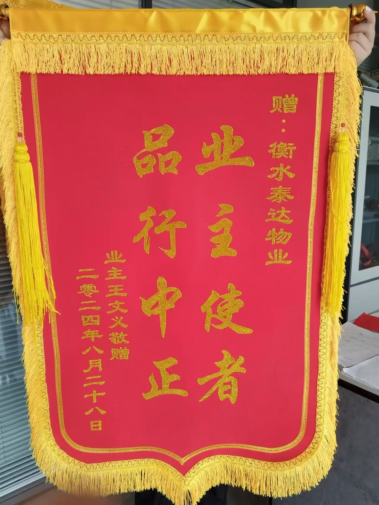 8月25日下午,泰达·桃城壹号A、B区项目客服主管刘向亚和保安队长张鹏程在巡检车库时候发现一位业主的前车窗户没关。经过积极查找车主信息告知了业主。业主急匆匆赶了过来,发现车里重要文件和贵重物品没有丢失,长松了一口气。为了感谢物业人员,业主特送上了一面锦旗。