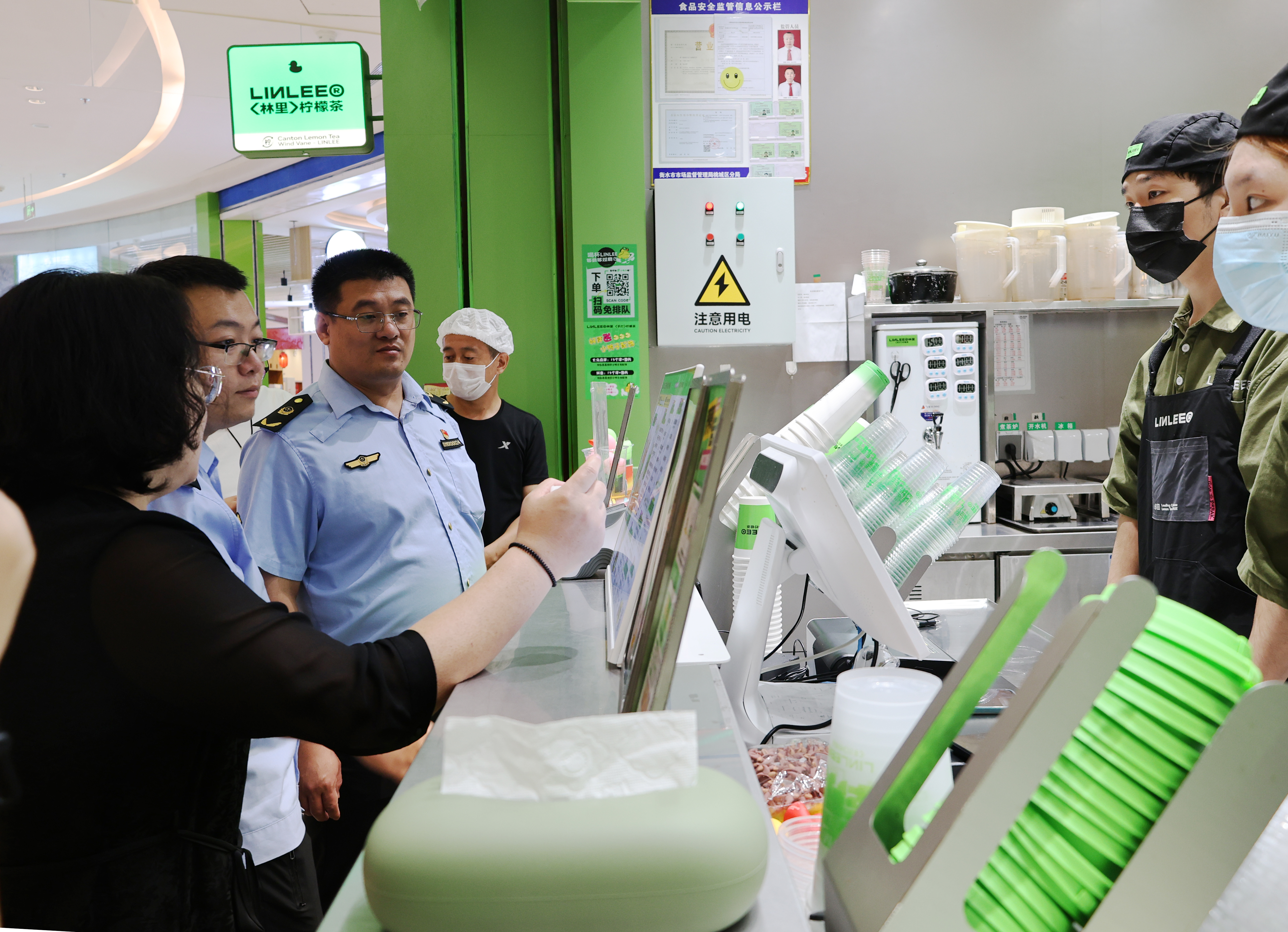 在一家柠檬茶店,执法人员同样对该店经营者资质、原材料品质等进行了详细检查,并积极向餐饮服务经营者宣传制止餐饮浪费的相关要求。