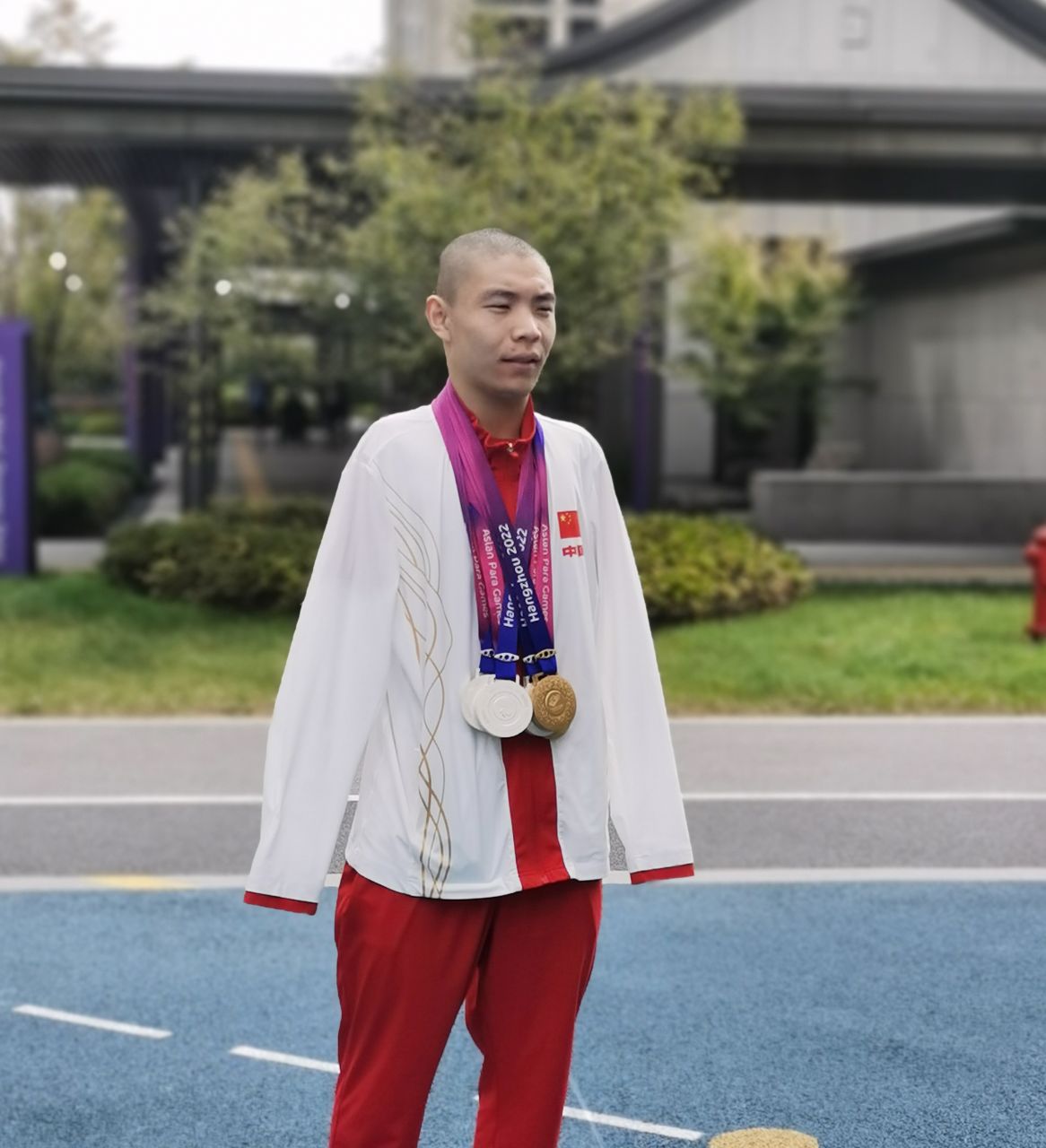 杭州亚残运会期间,在亚运村里郭金城身带奖牌。资料图
