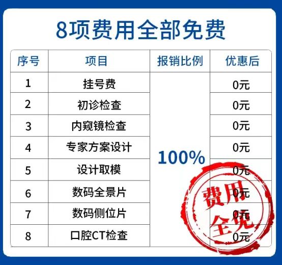 1.免费口腔检查:包含挂号费、检查费、拍片费、3D数字影像、方案设计费等全免。