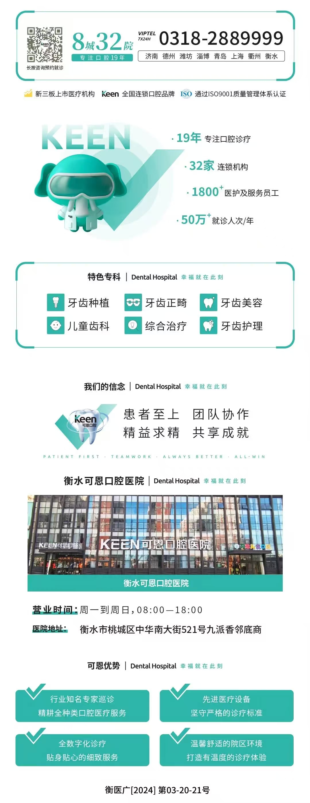 为响应《口腔健康行动方案》,提升全民口腔健康水平,衡水可恩口腔医院推出众多看牙福利,针对费用较高又不在医保报销范围内的牙齿修复、种植牙、牙齿矫正等项目增加专项补贴,即日起-9月30日可享限时特别政策,扫码即可申领,或拨打电话0318-2889999报名,补贴细则如下:
