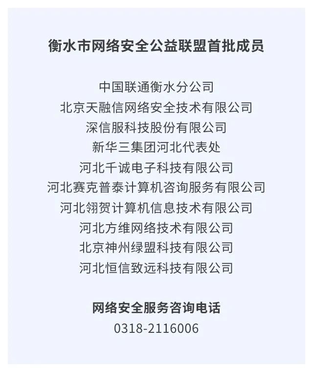为提升我市网络安全防护能力、有效应对各类网络安全风险隐患,9月4日,在市委网信办指导下,衡水市网络安全公益联盟正式成立。