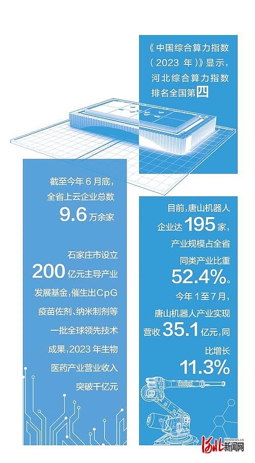 张家口谋建京津冀“算力之都”,目前累计投运大数据服务器160万台;位于廊坊的河北人工智能计算中心,是河北首个国家新一代人工智能公共算力开放创新平台……《中国综合算力指数(2023年)》显示,河北综合算力指数排名全国第四。海量数据汇成“算力长河”,筑起河北算力新优势。
