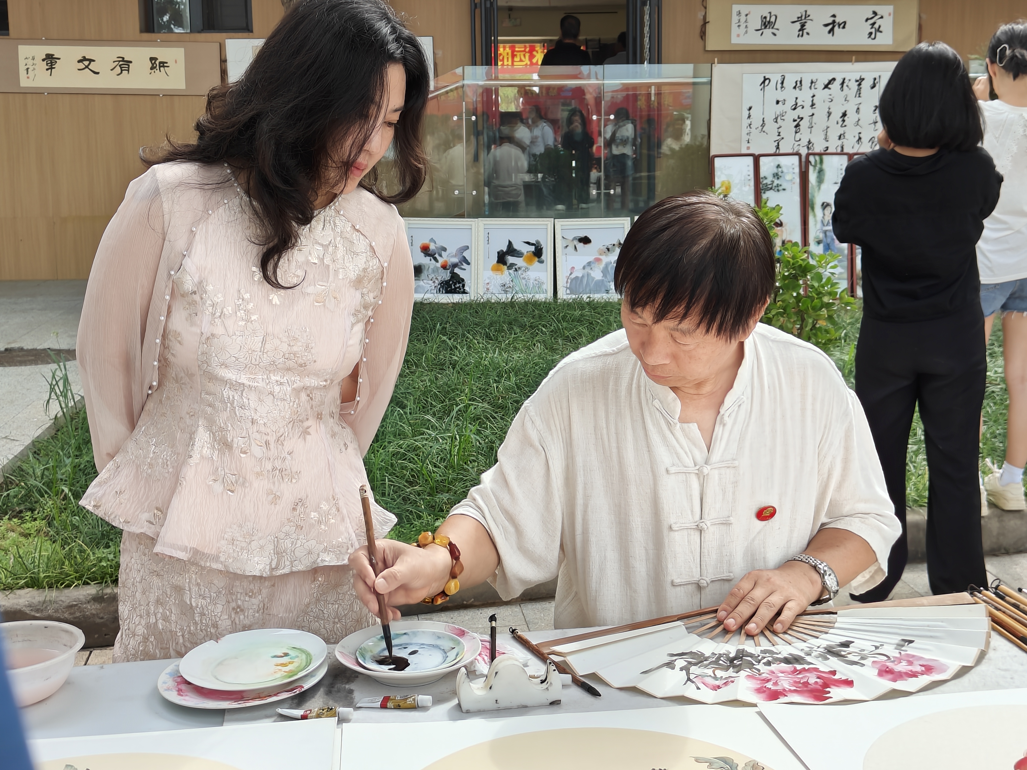游玩一圈回到码头,迎面是两位艺术家在伏案挥墨,手腕转动间,便是一幅花鸟画,兰花淡雅、鸟儿灵动,顿时消散了游客的疲乏。