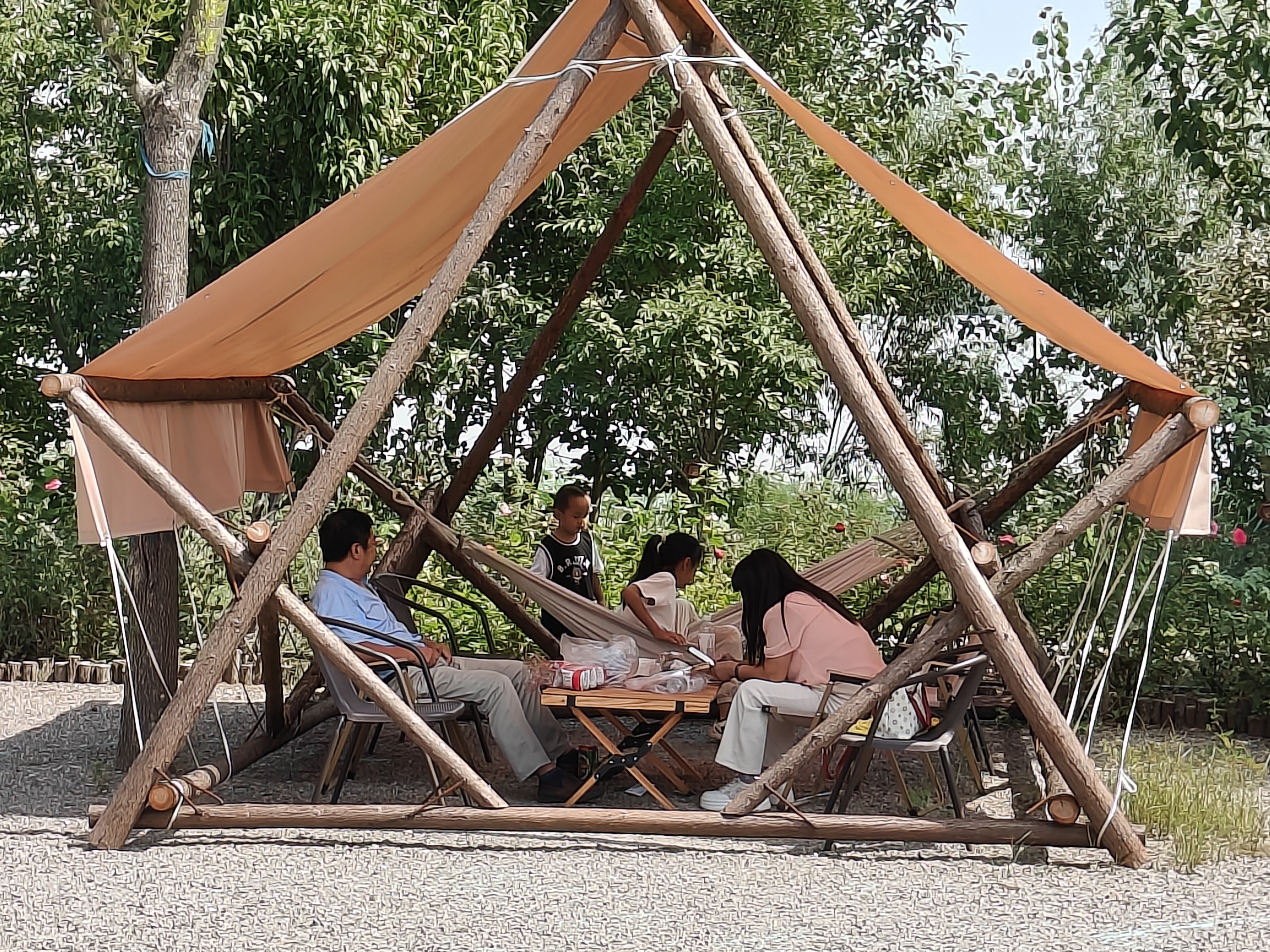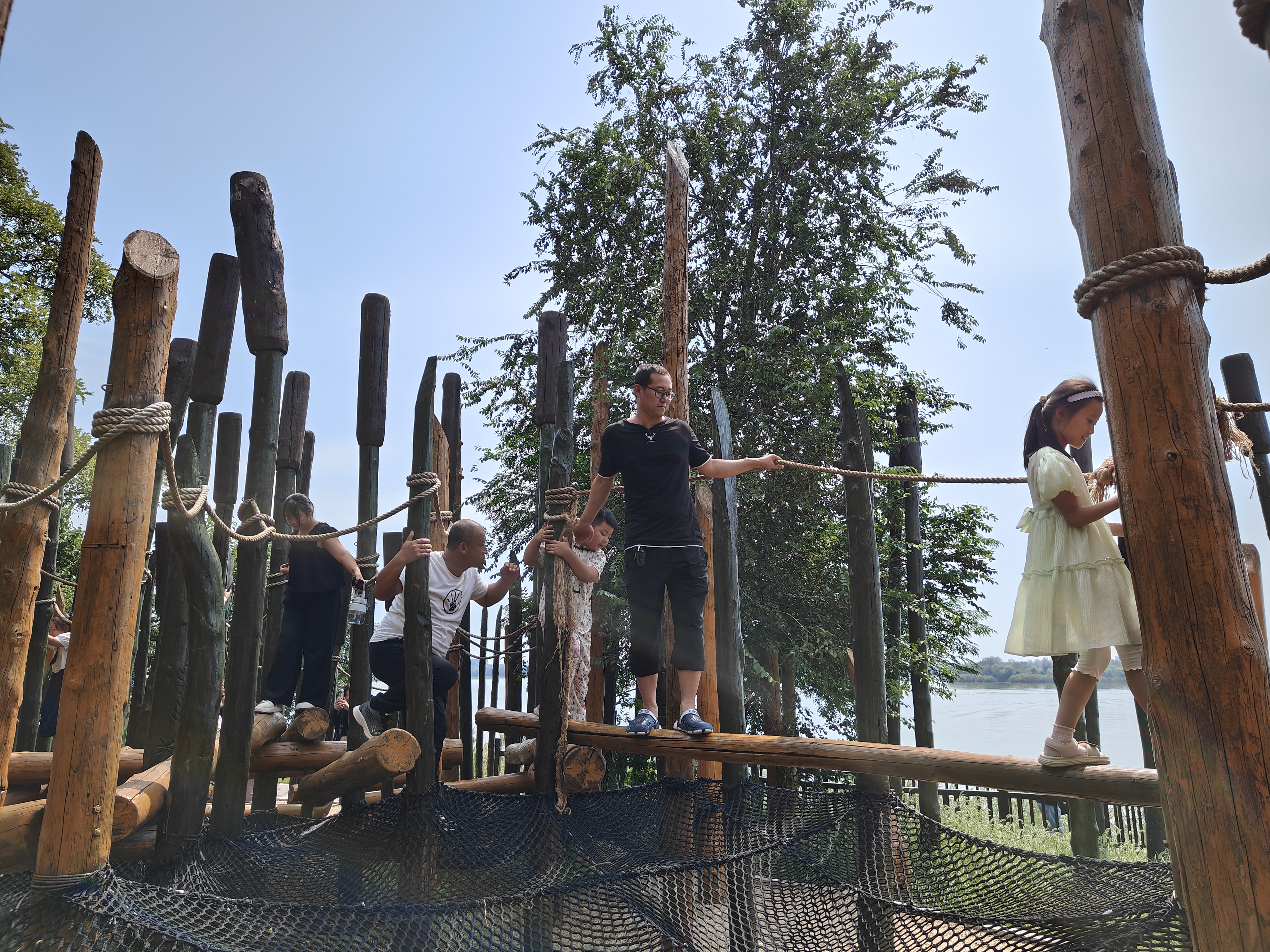岛内花丛两边,有的游客在野餐露营,有的在吊床旁嬉戏玩闹,还有的在林中玩起了攀爬……欢声笑语,不绝于耳。沿着小路一直前行便来到了充满了惊险和刺激的树道天桥,天桥的正中设有依鸟类巢穴形态而建的仿生鸟巢,表面虽由钢筋、绳索搭建而成,中间为镂空设计,游客们跃跃欲试,几人相互搀扶着探索前行。穿过仿生鸟巢,就来到了天桥的最高处。在这里,衡湖美景尽收眼底,令人心旷神怡。