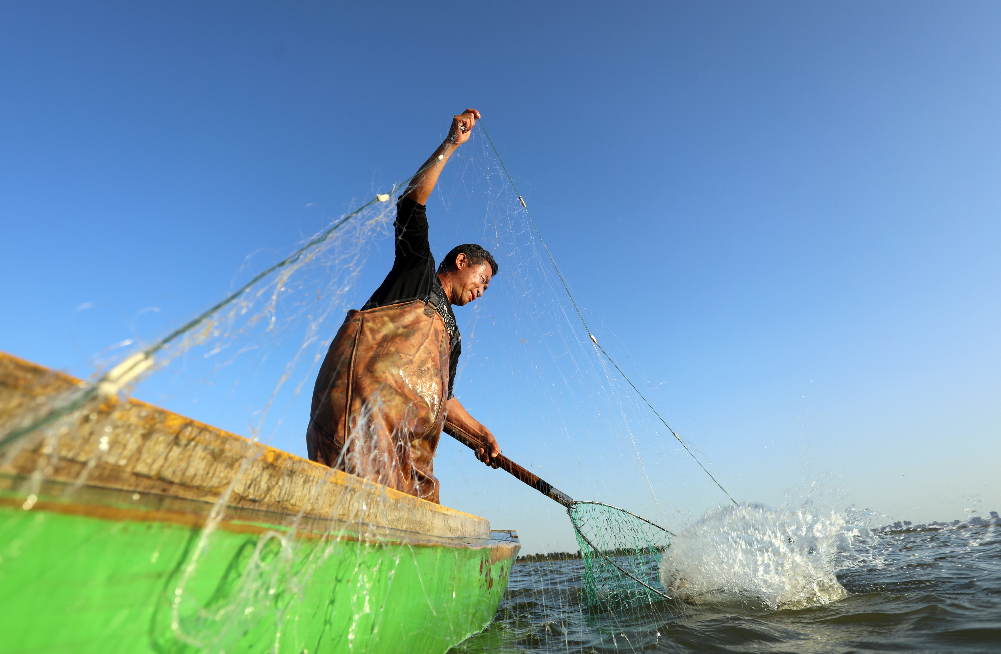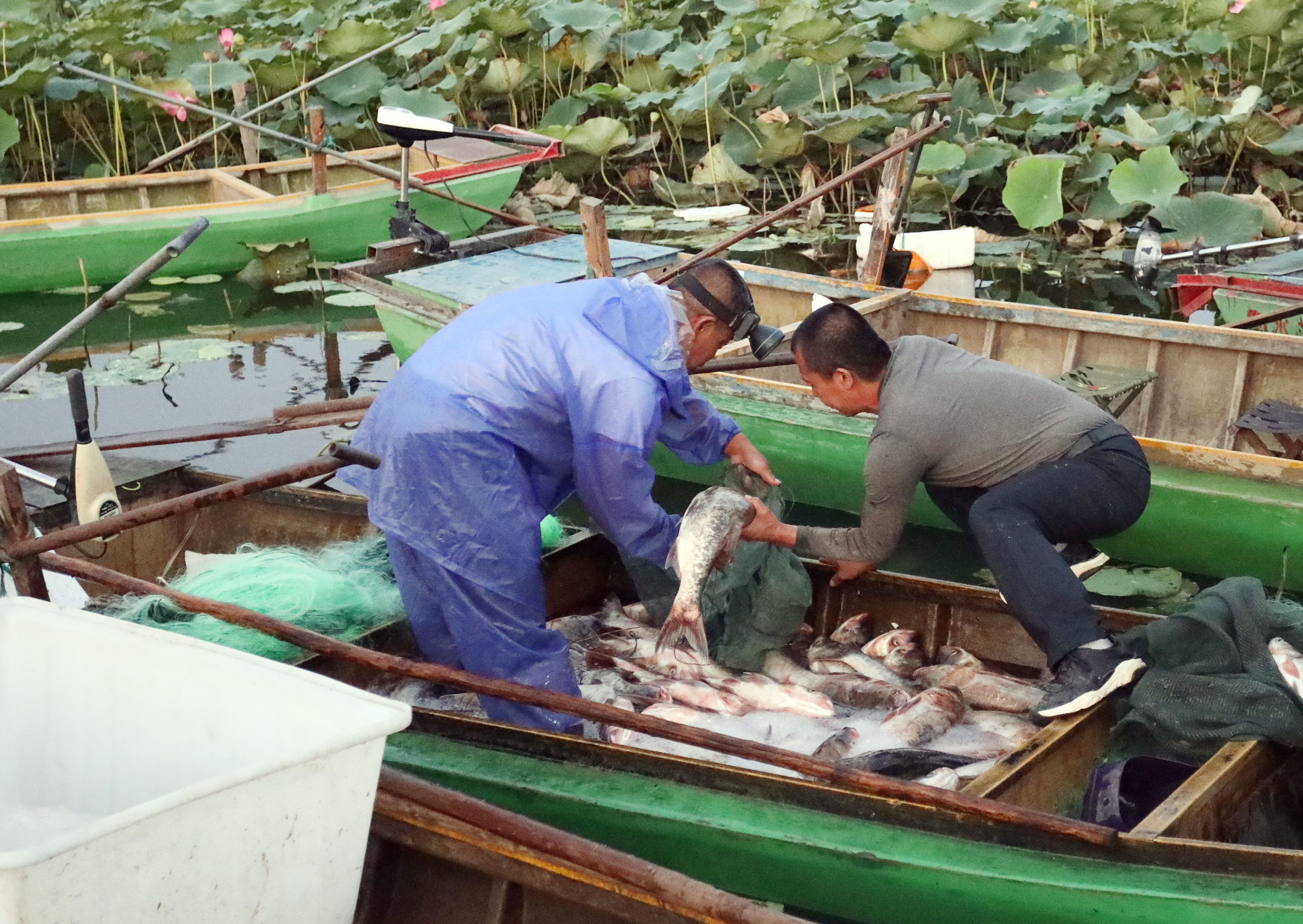 7时30分,湖面上,渔民们熟练地操作着渔船,寻找下网点,只见一张张巨大的渔网随着渔民的移动缓缓上升,一条条肥硕的鱼浮出水面,鱼跃欢腾时,人笑、鱼肥,好一幅丰收的幸福景象。