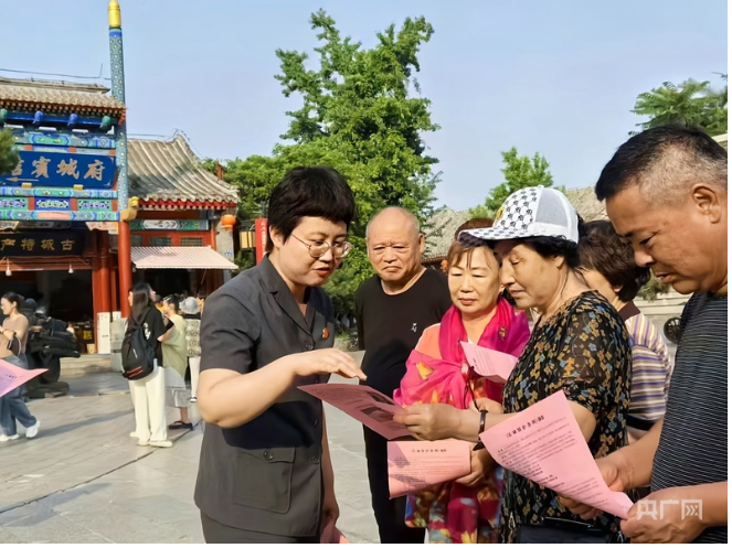 长城文化保护人民法庭庭长申妍(左一)对游客和商户宣讲《长城保护条例》(央广网发 受访者供图)