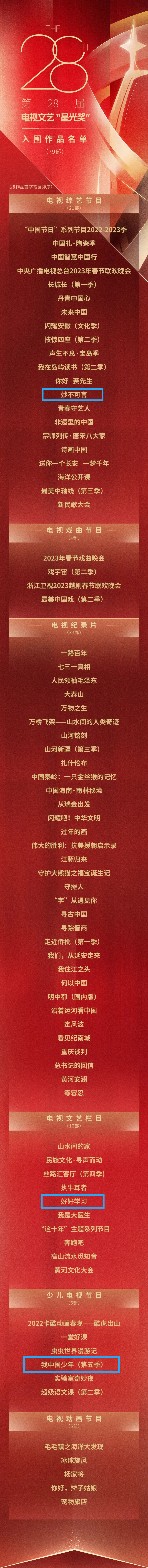 9月11日,第28届全国电视文艺“星光奖”入围作品名单正式公布。其中,河北广播电视台《妙不可言》、《好好学习》、《我中国少年》第五季 3档节目榜上有名!