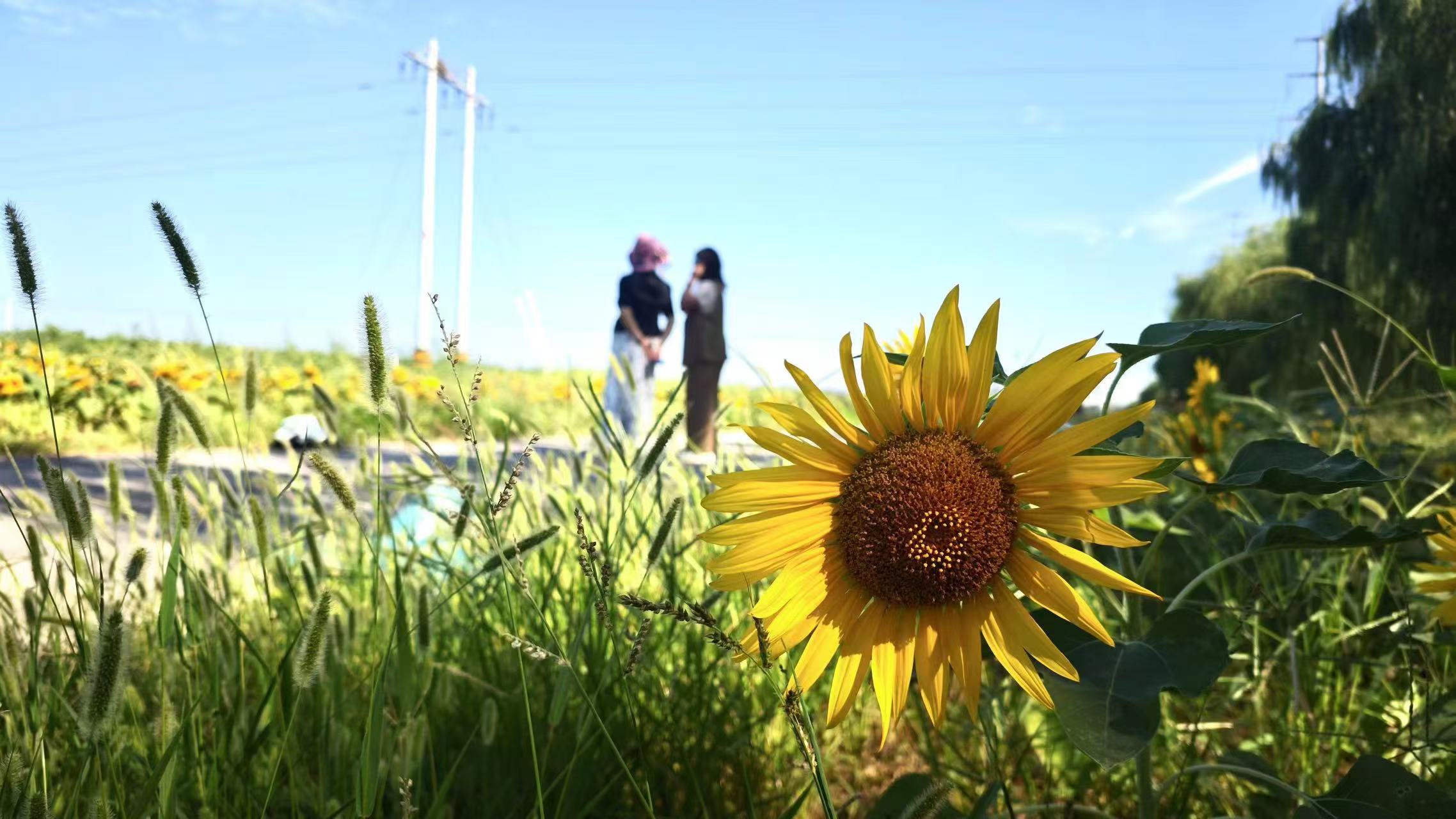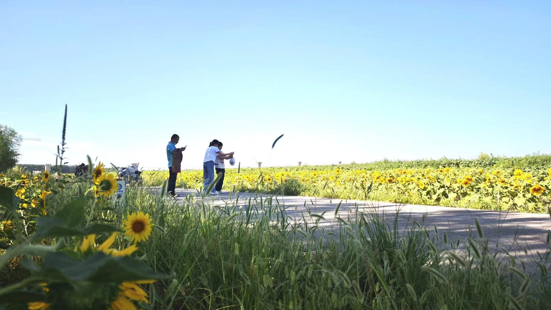 向日葵花海明亮而灿烂,游客漫步在花海中,仿若走进文森特·梵高所绘制的油画《向日葵》,金色花海衬着万里晴空,置身其中,又仿佛来到宫崎骏《龙猫》里的那片向日葵花海,游客被向日葵绚丽的光泽、饱满的轮廓打动,灿烂笑容在每个人脸上绽放,“金色花海”为这座城市增添了明媚的色彩。