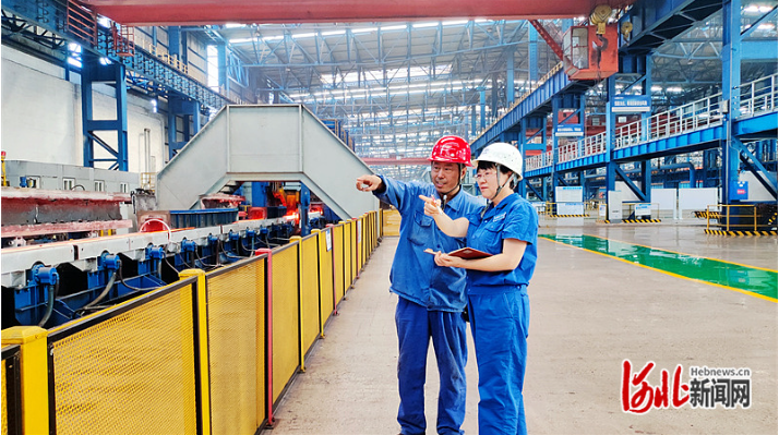 9月5日,郝彦英(右)在石钢新区小棒生产线跟踪查看绿色钢种生产情况。河北日报通讯员 高益芳摄