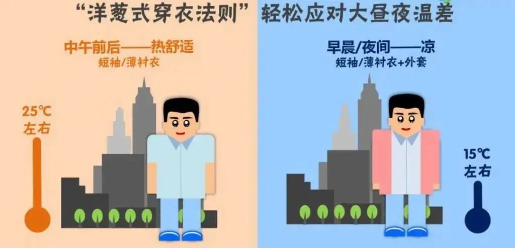 虽然现在没有了夏天的酷热,但一早一晚凉意明显,市民朋友可以选择“洋葱式穿衣法”,早出晚归时穿件外套,根据气温变化随时穿脱,以免着凉引发身体不适。