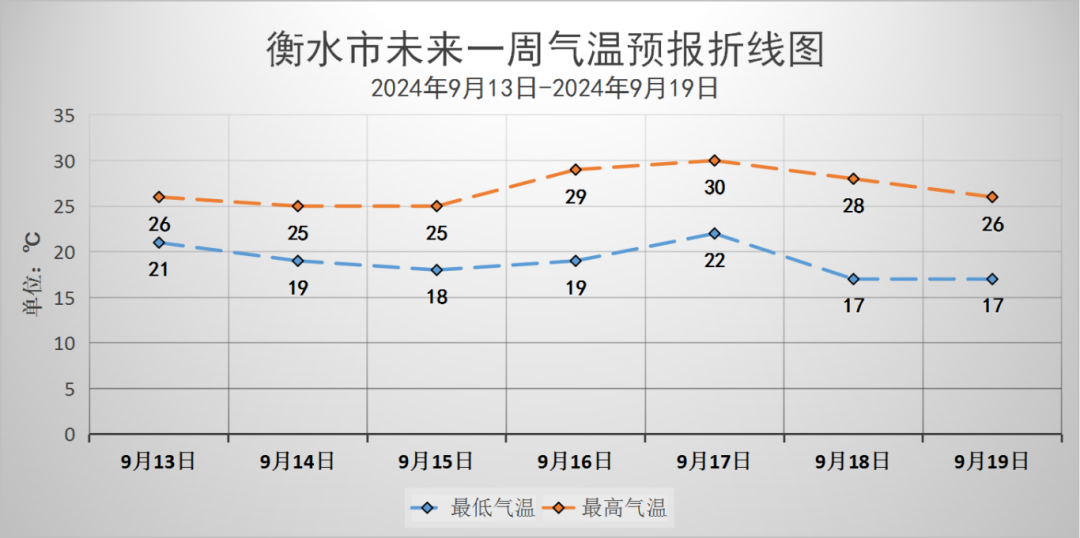 具体预报:9月13日,多云转阴,有分散性阵雨或零星阵雨,气温:26到21℃;9月14日,多云,气温:25到19℃;9月15日,多云,气温:25到18℃;9月16日,多云,气温:29到19℃;9月17日,多云,气温:30到22℃;9月18日,多云间阴,气温:28到17℃;9月19日,多云,气温:26到17℃。